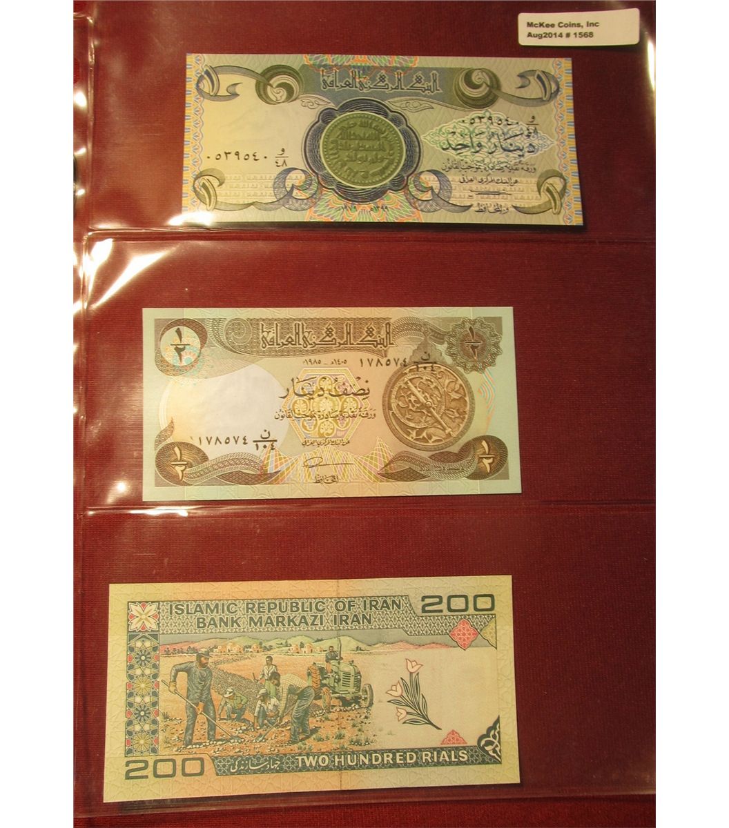 1568. (2) Central Bank of Iraq Bank notes & a 200 Rials Islamic Republic of Iran Bank note. All CU.