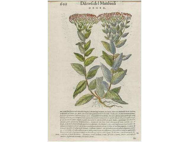 1568., GRABADO: (GRABADO-XILOGRAFIA),. MATHIOLI, ANDREA:, DOS GRABADOS, 602 DISCORSI DEL MATHIOLI, DRABA y 1102 DISCORSI DEL MATTHIOLI, CHRISANTHEMO., Dos grabados xilográficos coloreados 31,5 x 20,5 cm, montados en marcos de 52 x 32 cm. Extraídos de la obra ´Comentarii in sex libros Pedacii Dioscoridis´ de Pietr Andrea Matthioli, que estudió medicina en la universidad de Padua y se graduó en 1523. Aunque fue el médico personal del rey de Austria su interés principal siempre fue la botánica, materia en la que destacó hasta estar considerado uno de los más grandes botánicos de su tiempo; catalogó cientos de especies de plantas, descubrió nuevas, las describió con gran exactitud y además las dibujó con una precisión extraordinaria. Su contribución a la botánica y la relevancia de su obra le llevó a ser una de las autoridades en la Enciclopedia y a ser traducido, ya en su época, a muchas otras lenguas.