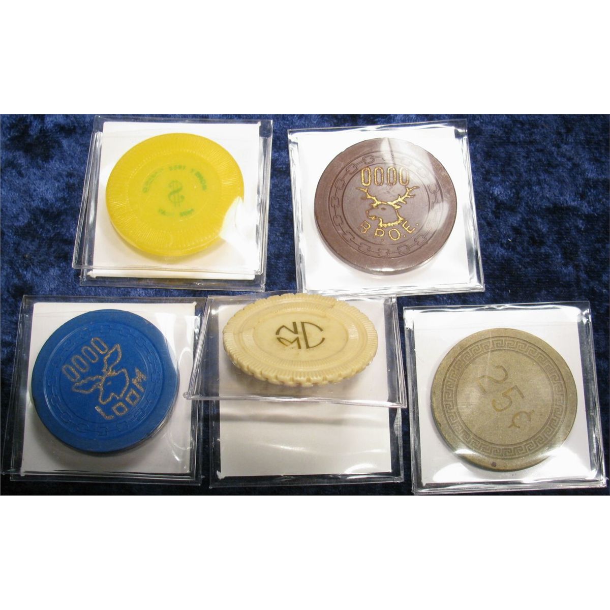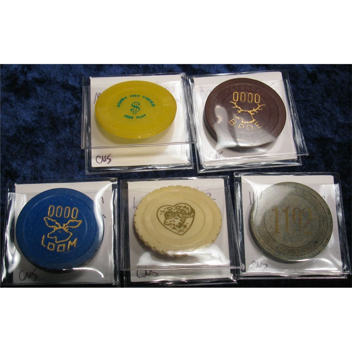1568. Money Tree Casino $1 Gambling Chip; (3) different "OOOO" Elk & Moose Lodge Gambling Chips; & Lodge 1192 .25c Gambling Chip.