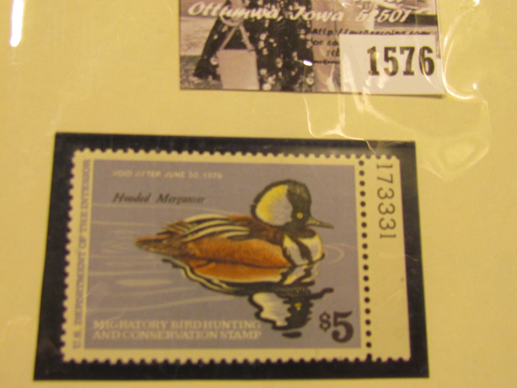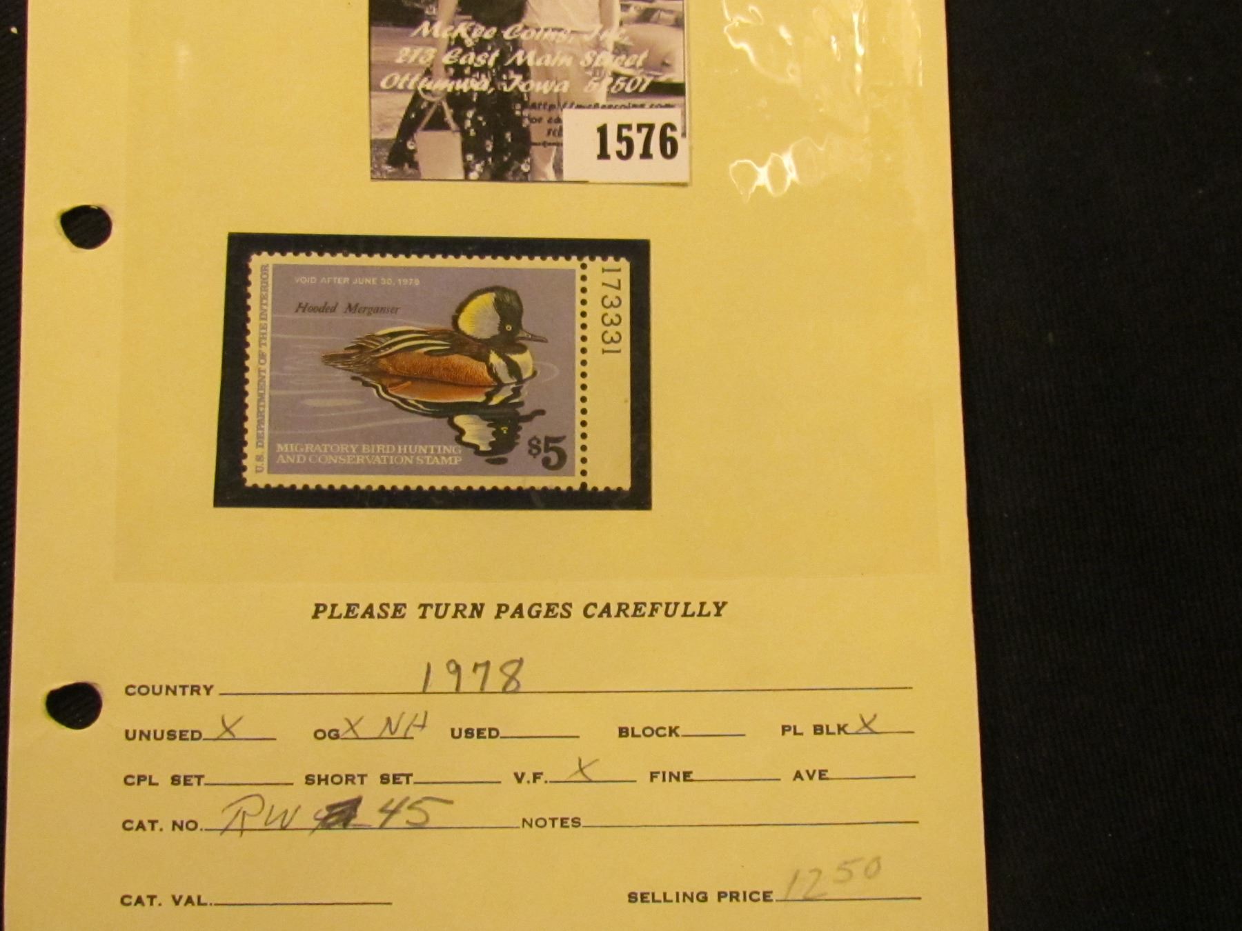 1576 . 1978 RW45 U.S. Department of the Interior Federal Migratory Waterfowl Stamp. Plate number single, unused, not signed, OG, NH, VF.