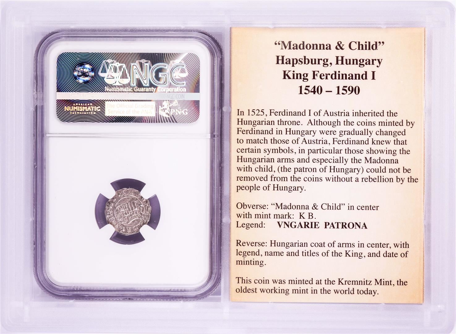 One 1577 KB Hungary Denar 'Madonna and Child' Coin NGC XF45 w/ Story Box. NGC Certified.