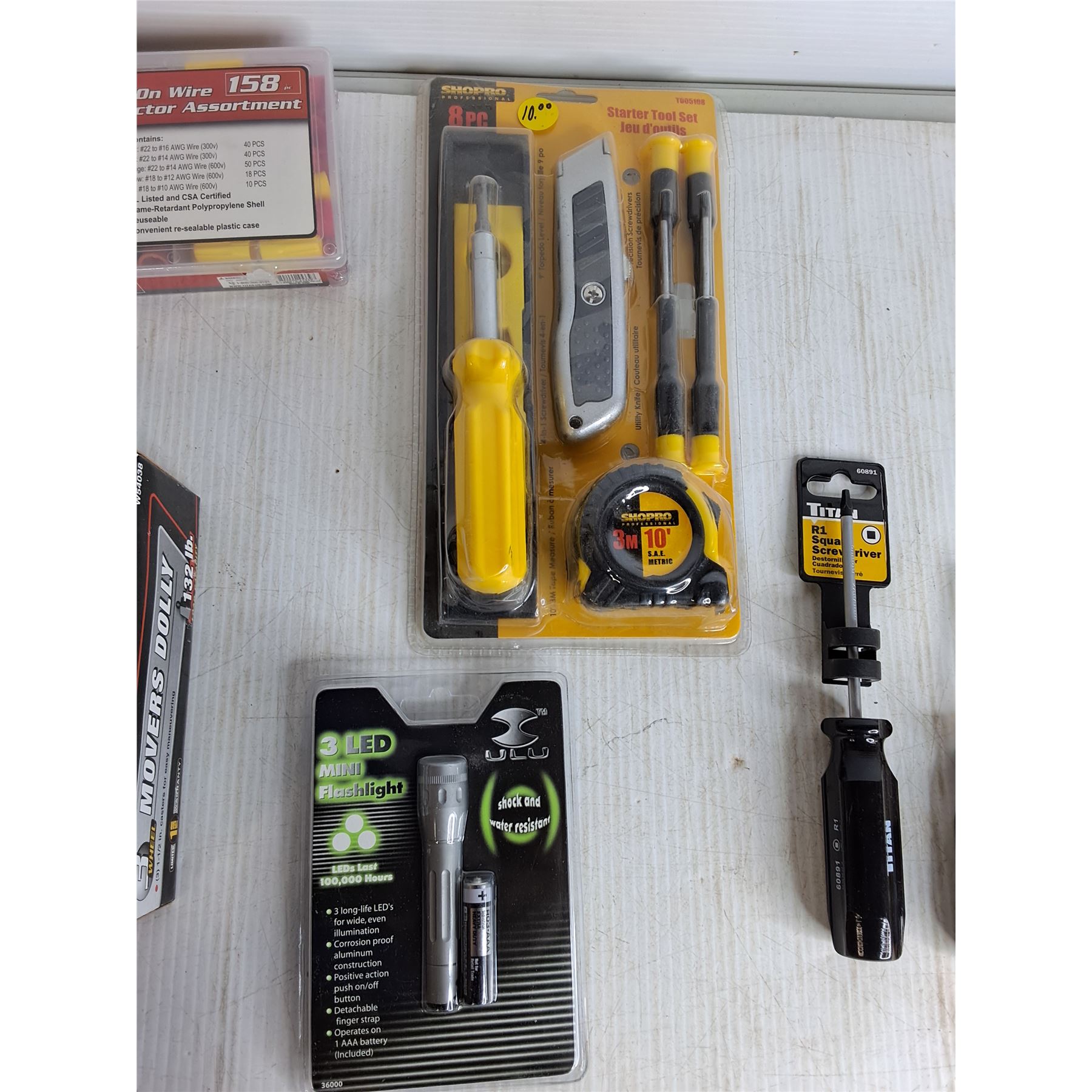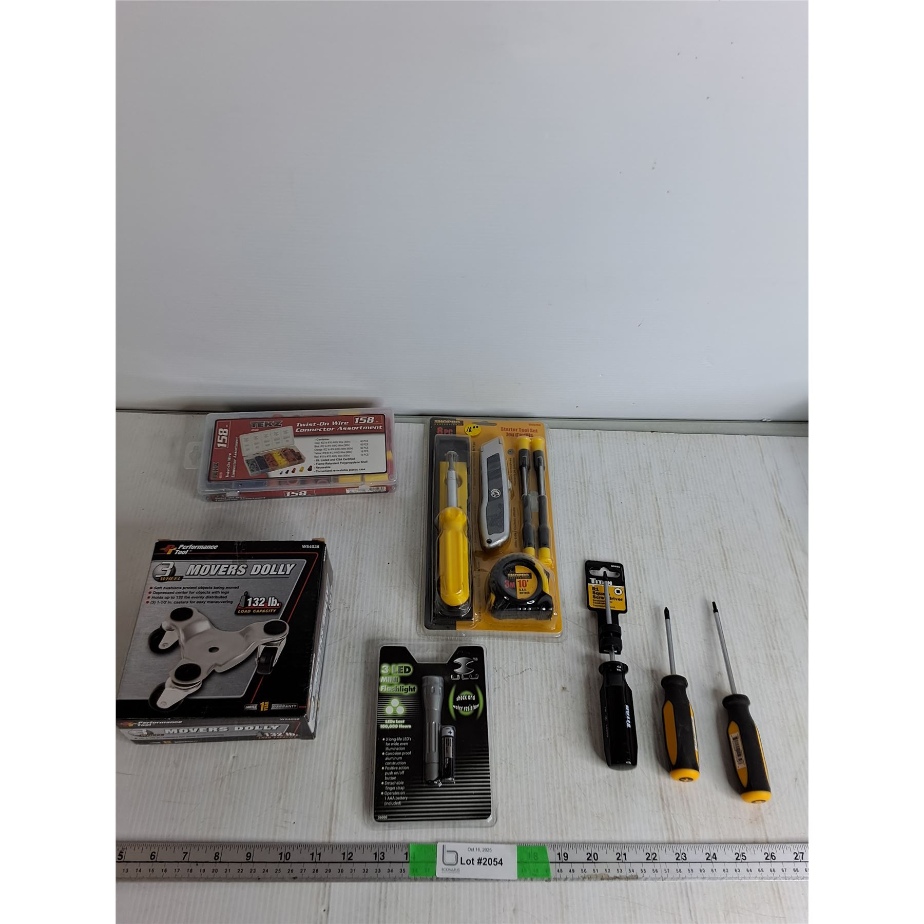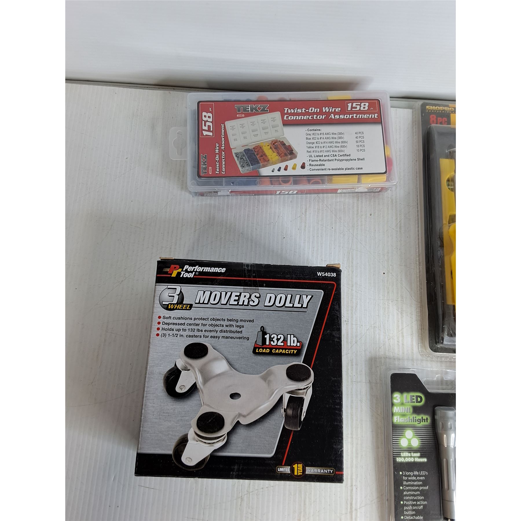 158 Pcs Twist On Wire, 8 pcs Starter Tool Set, 3 Wheel Dolly Mover, LED Mini Flashlight, Misc