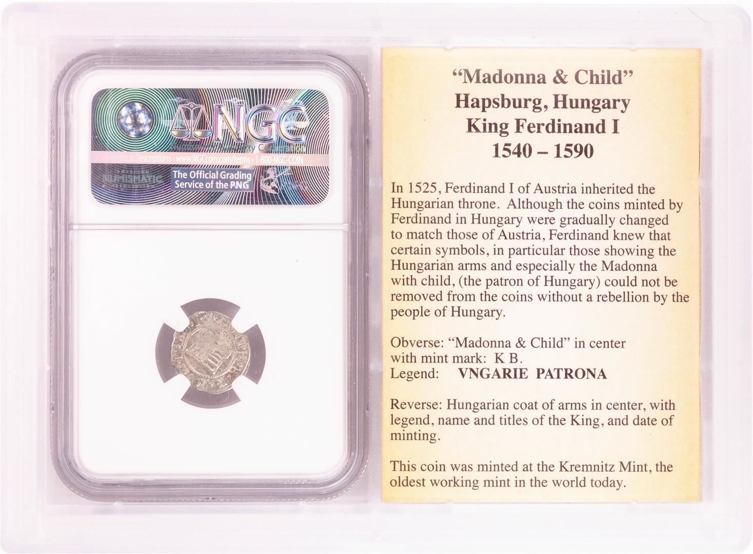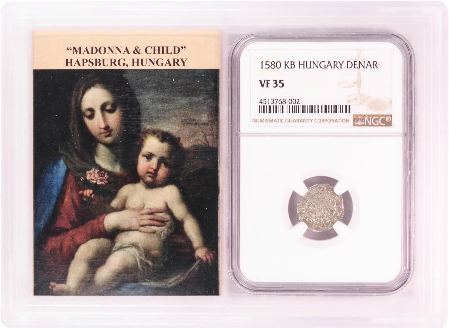 One 1580 KB Hungary Denar 'Madonna and Child' Coin NGC VF35 w/ Story Box. NGC Certified.