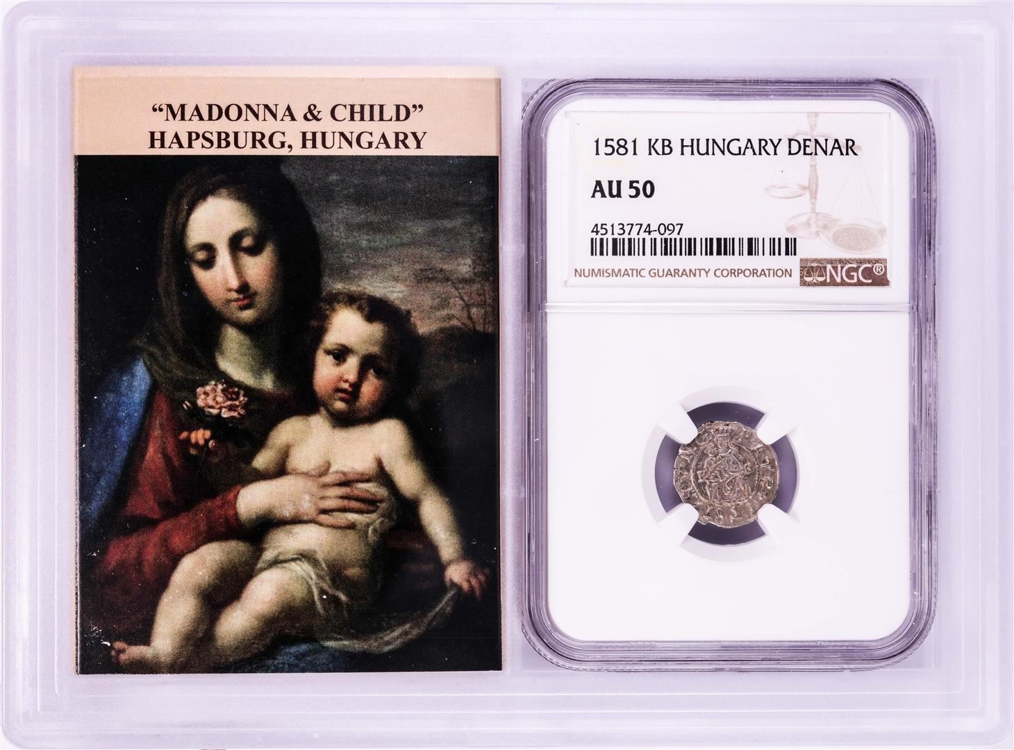 One 1581 KB Hungary Denar 'Madonna and Child' Coin NGC AU50 w/ Story Box. NGC Certified.