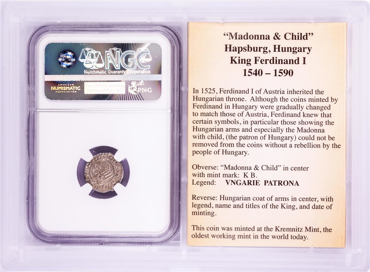 1581 KB Hungary Denar 'Madonna and Child' Coin NGC AU50 w/ Story Box