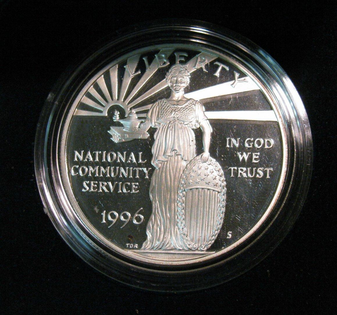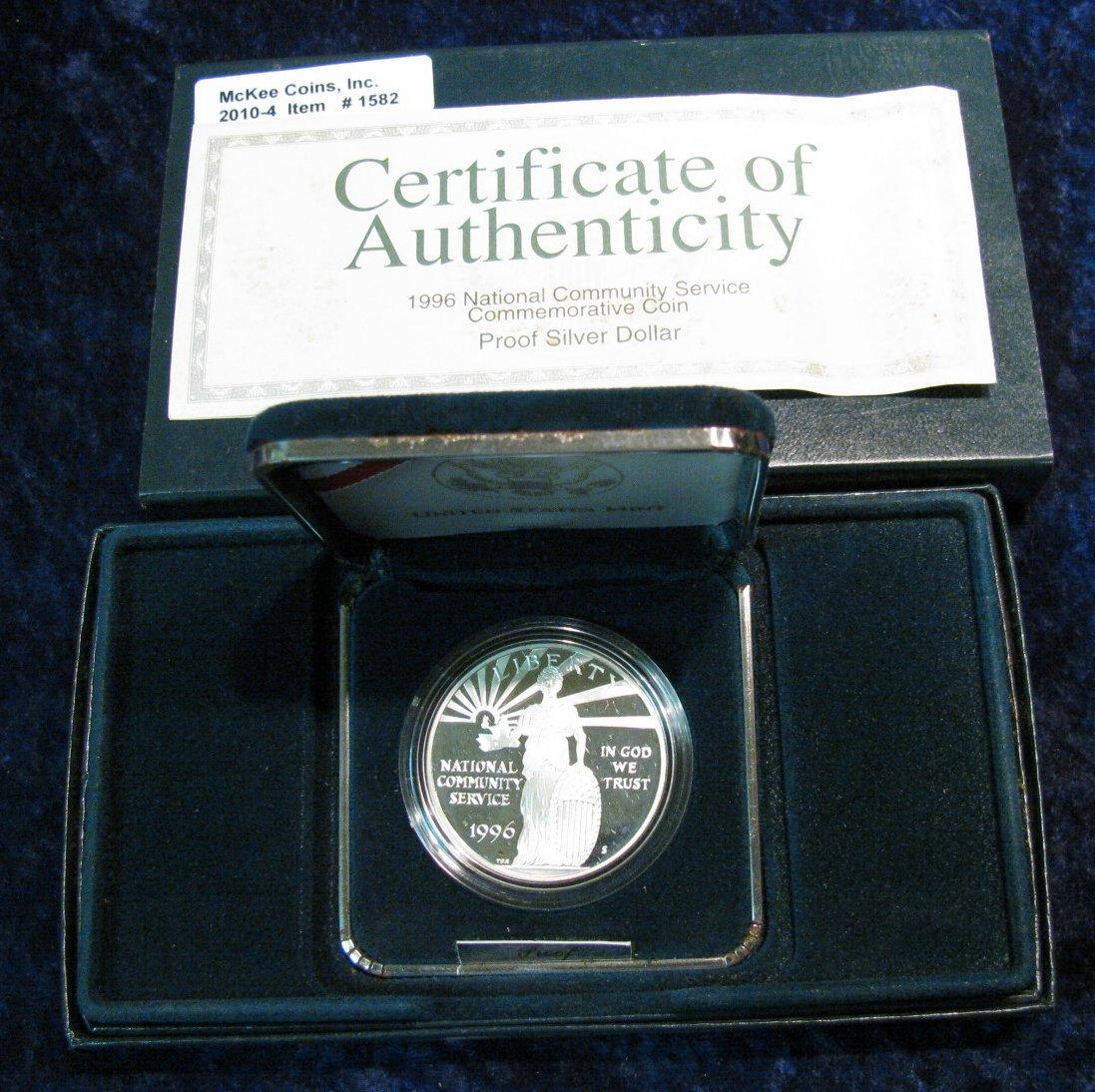 1582. 1996 S National Community Service Proof Silver Dollar. Case has slight water damage.