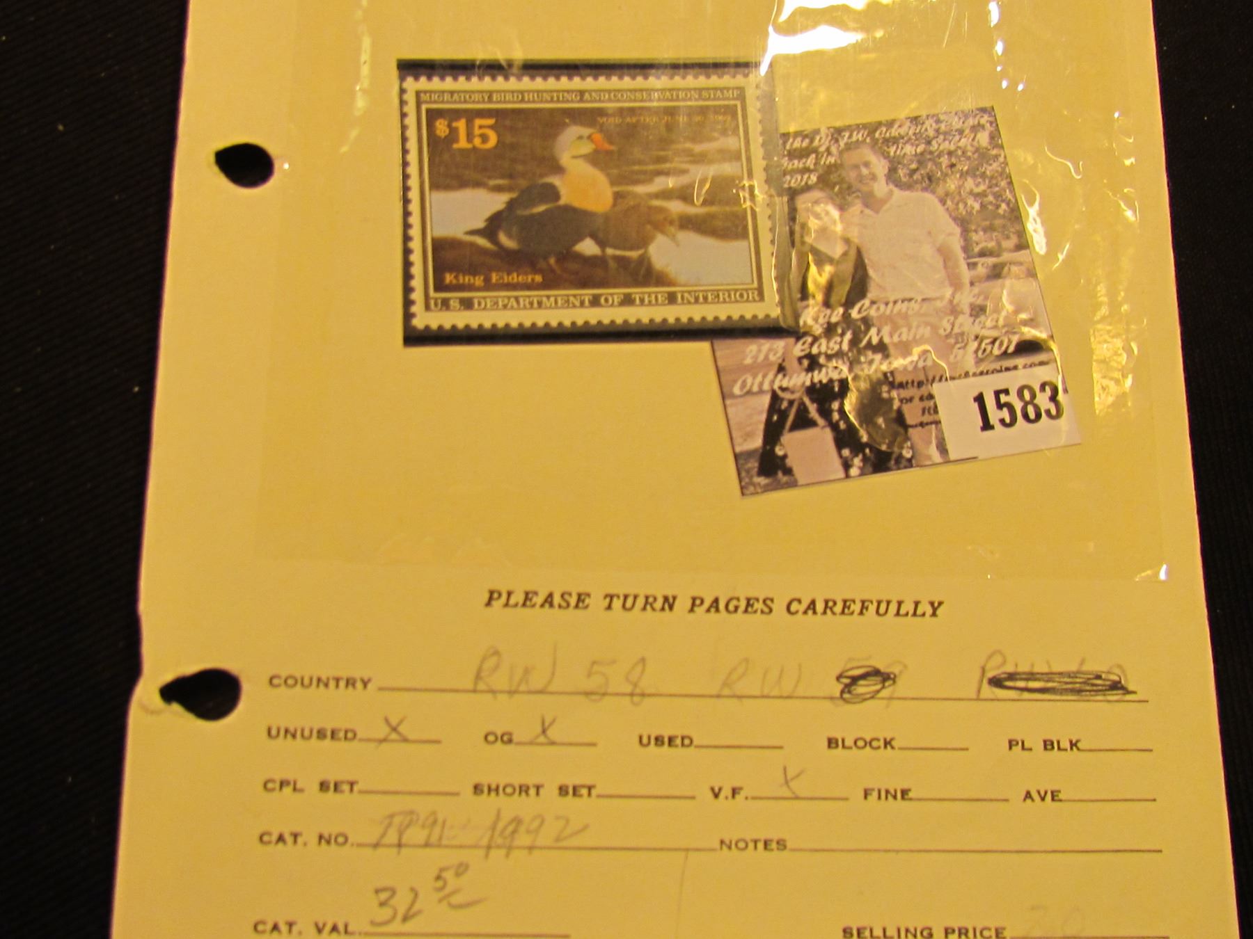 1583 . 1991 RW58 U.S. Department of the Interior Federal Migratory Waterfowl Stamp. Unused, not sign