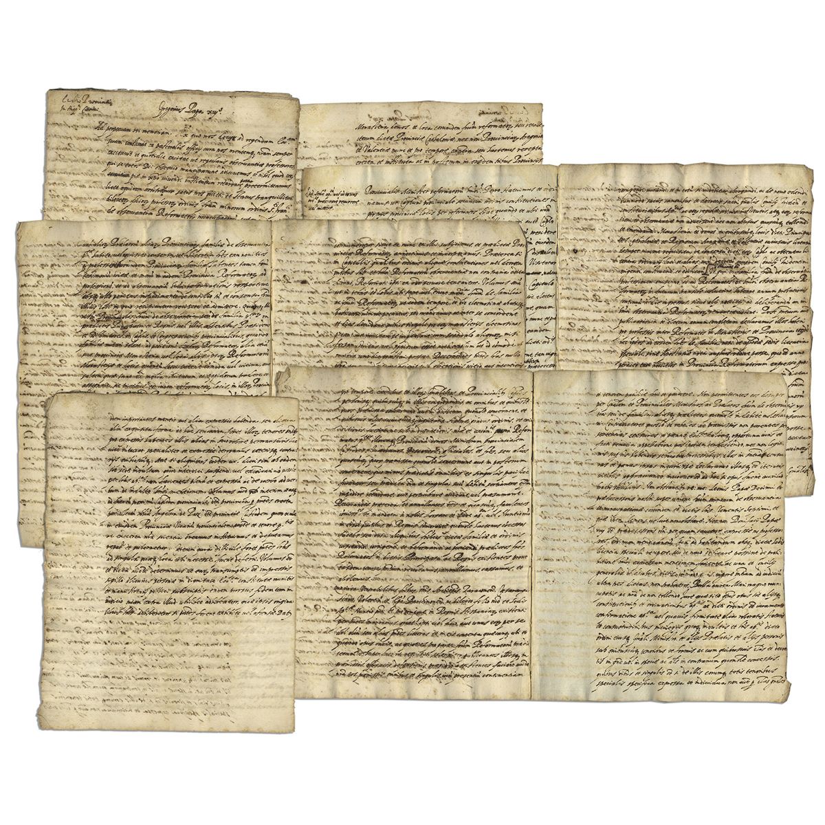 Lengthy ten-page manuscript from the Papacy of Gregory XIII, most likely a copy of a document granting autonomy to the Spanish provinces of Catalonia, Valencia and Aragon. During his papacy, Gregory XIII commissioned the Gregorian calendar, still the accepted civil calendar to date. Document is partially translated: ''After listening to the supplications of the Order of the Minor Friars, both the Reformers and Discalced of the which had already been granted to them by Clement VII. Thus they could continue tranquilly governing their own order in these provinces, in all of their monasteries, houses and all other property, meeting in their general chapters, without the outside influences from anyone else, nor anybody requesting their members be moved to other provinces...'' Measures 8'' x 10.75'' upon 10 pages of card-style stationery, with the first page detached. Paper is soft from age with toning and showthrough, very good condition overall.