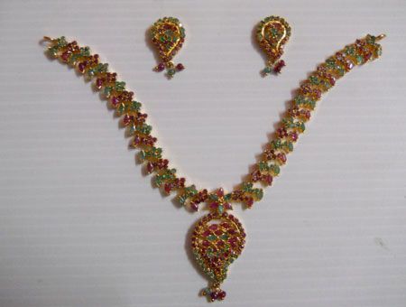 159.0 CTW GOLD PLATED EMERALD/RUBY NECKLACE AND EARRING **|**|** 159.0 CTW GOLD PLATED EMERALD/RUBY NECKLACE AND EARRING SET STERLING SILVER ; MSRP: $1600