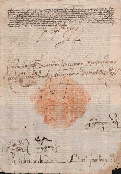 Interesting land grant warrant issued by King Phillip II of Spain and signed by him on the 22nd of October 1592. Relating to land at the Residencia de Ronda, Aragon Spain involving Chunasco Aquilar and Antonio Vazquez. With engraved portrait of King Philip