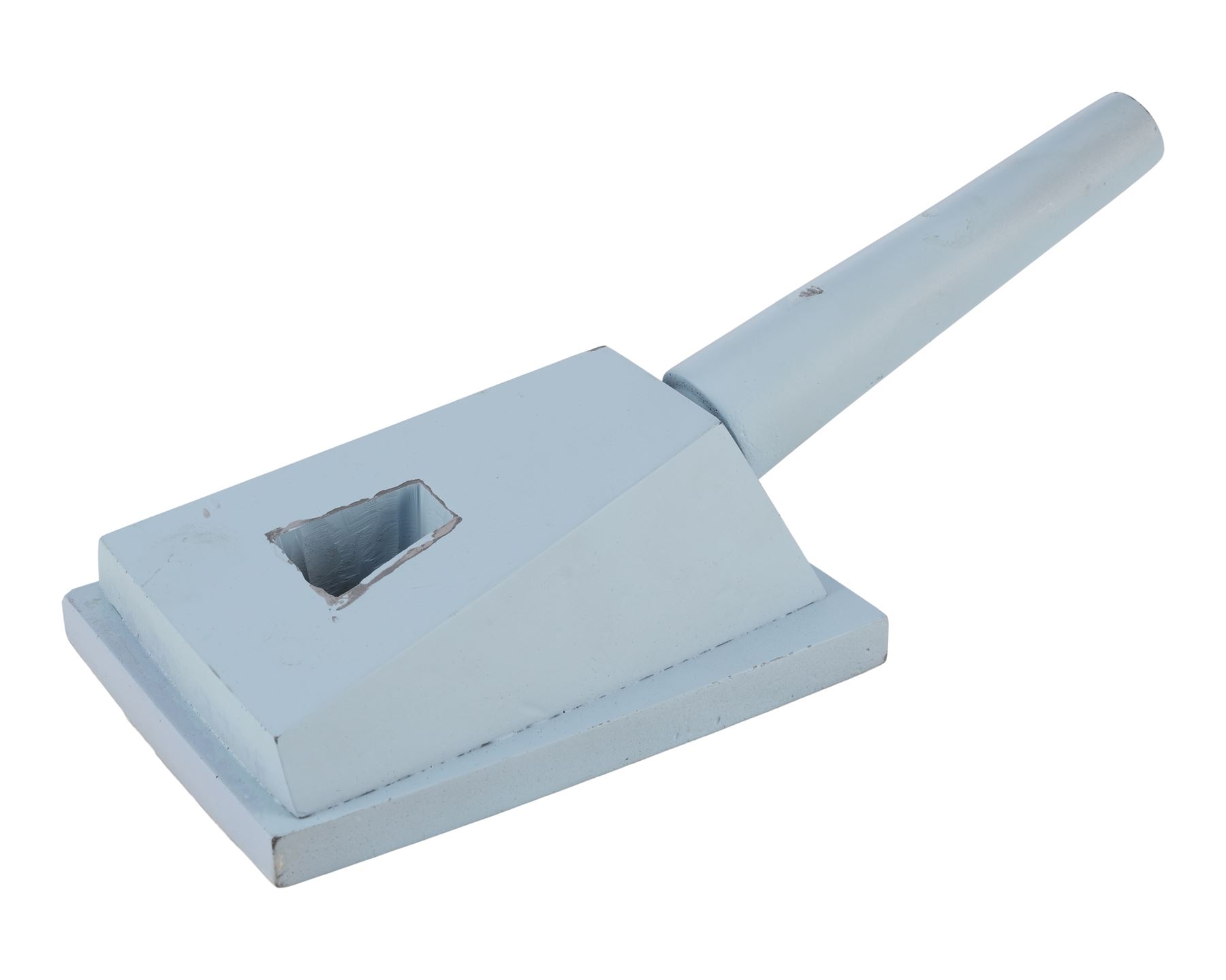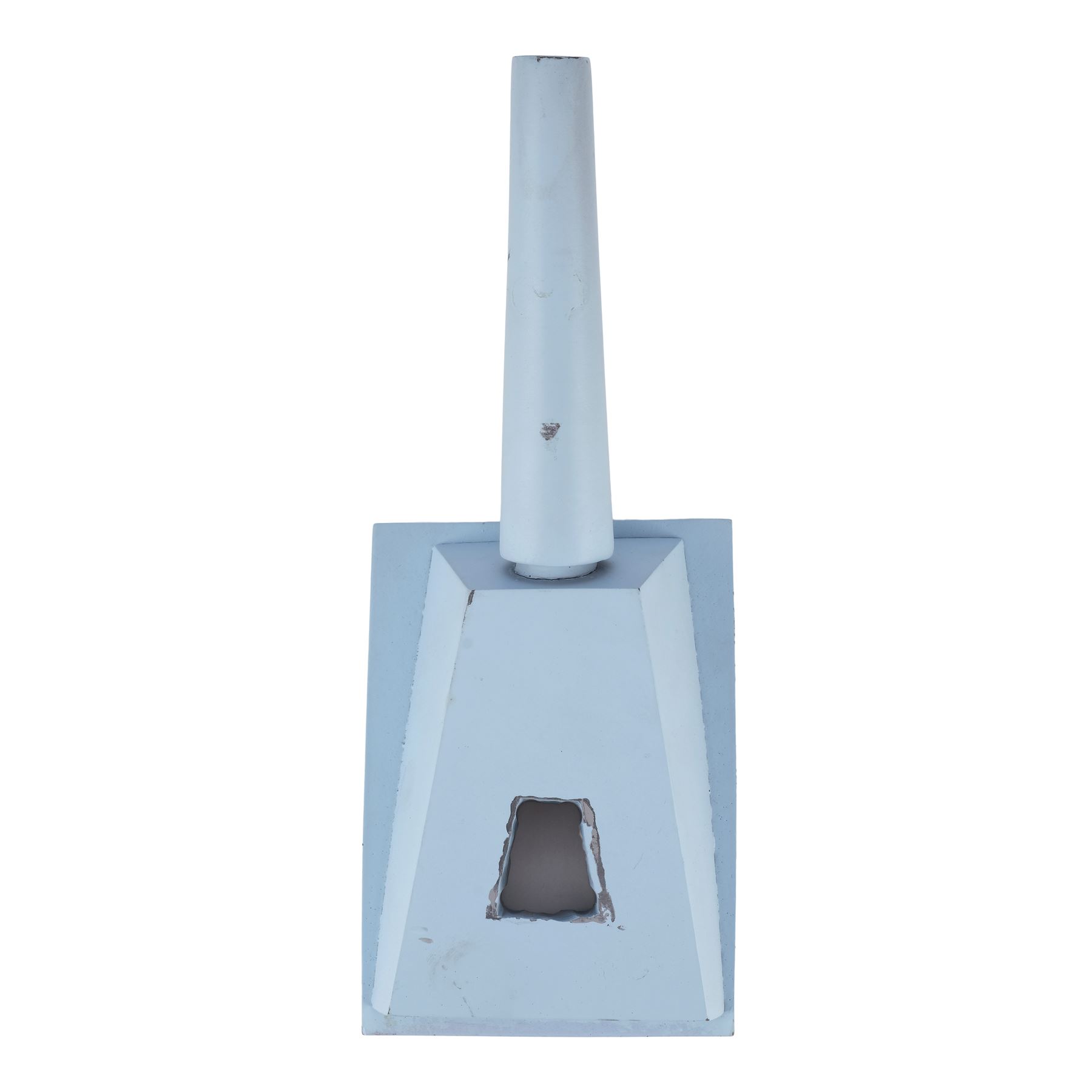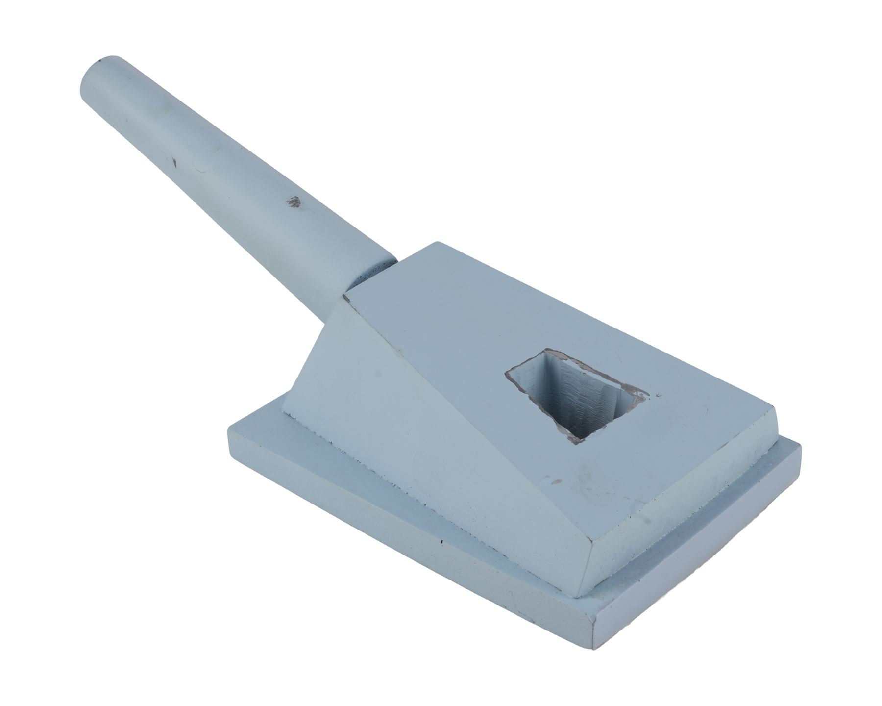 This lot consists of a two-piece wooden handle, including a body segment with a hole in the center for inserting a light and a dowel inset at the bottom, as well as a metal ladder segment painted red with three vertical shafts, a triangular base with holes for mounting to a larger surface, and rounded, horizontally-oriented rungs between each shaft. Both handle components are painted in matching gray with a matte finish. The handle is scuffed at top and scratched around the lighting hole, while the ladder segment exhibits paint chipping from production use. Dimensions: 10.25" x 4.25" x 4.25" (26 cm x 11 cm x 11 cm)