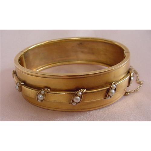 </font></strong>Great looking 15K yellow gold (slightly rose gold) hinged bangle bracelet with seed pearls from the late Victorian period. This beautiful bangle has an applied band on the front with six larger and twelve smaller seed pearls. Bracelet has a secure tongue in groove clasp and a safety chain. Approximately 6 1/2" inner circumference. Fits a small to average size wrist. Weighs 23.8 grams. Very good condition. Circa 1890.</font>