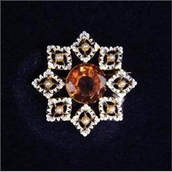Lot 114 15KT C. GIULIANO BROOCH Beautiful 15kt yellow gold brooch is set with large center citrine which is surrounded by eight diamond shaped enameled panels set with a seed pearl in center of each.  The brooch is housed in original presentation box which is marked on inside of lid “C. Giuliano K15 Piccadilly London”.  SIZE:  1-3/4” across.  CONDITION:  Very good to excellent.  5-70832