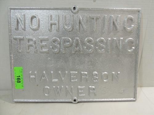 15X11 VINTAGE CAST IRON FARM SIGN: NO HUNTING TRESPASSING, HALVERSON OWNER. LOCAL METAL FOUNDRY - BELOIT WISCONSIN. AS SHOWN. VIEW PICTURE FOR DETAIL.