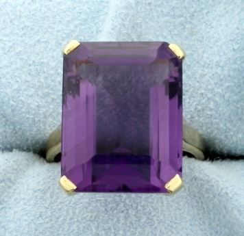 In 14K yellow gold, the ring contains 18x14mm high quality emerald cut amethyst with excellent color & clarity. Size 7 8.5g
