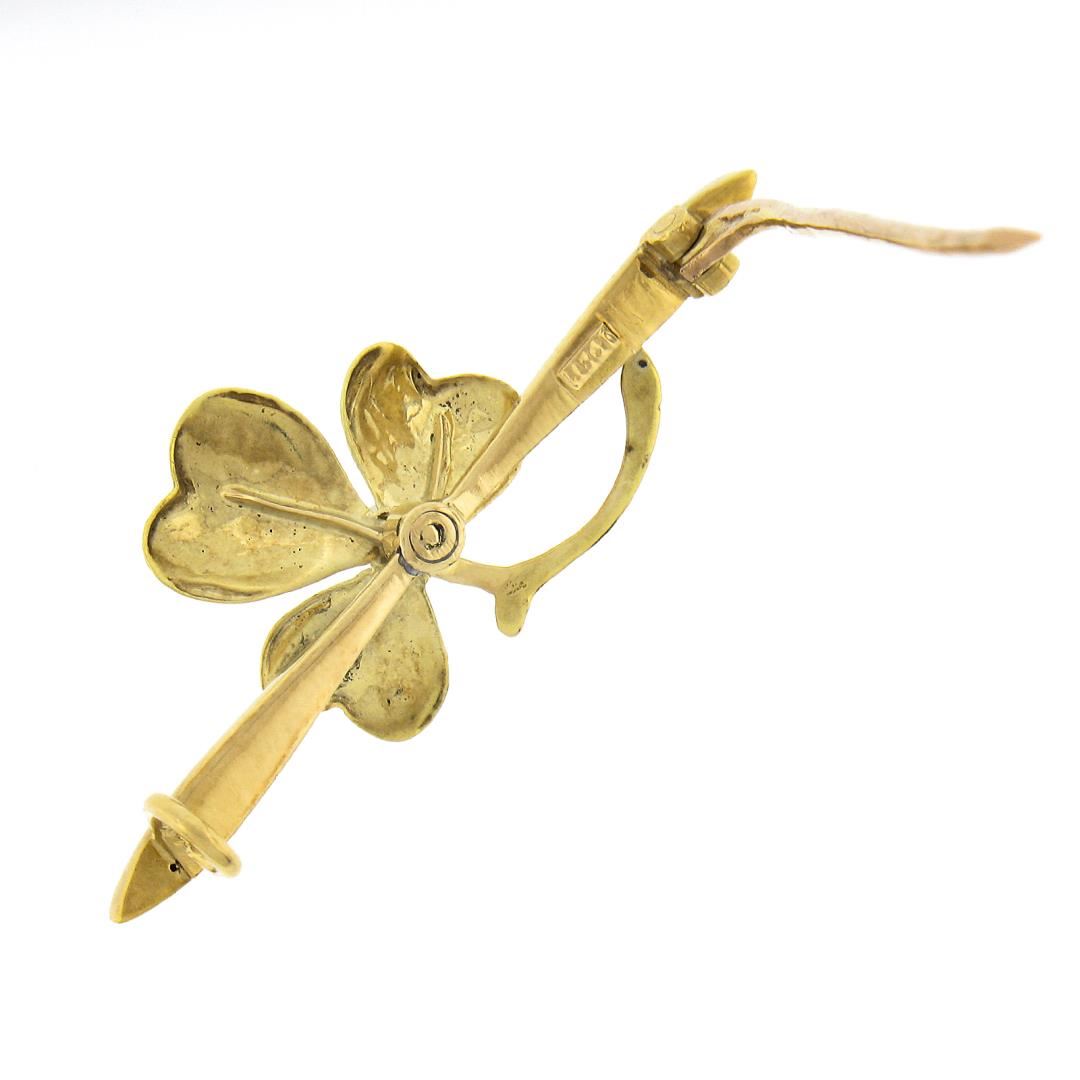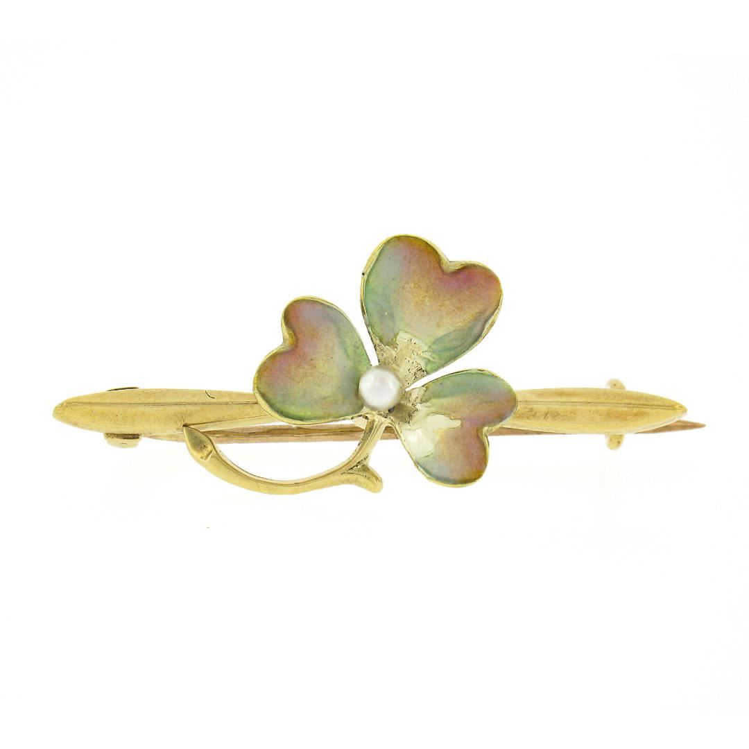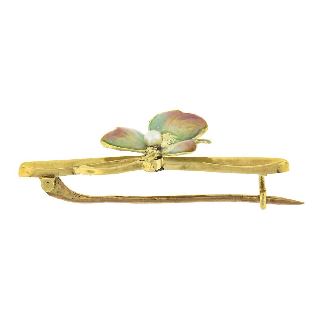 A solid 15k yellow gold brooch, with enamel work and 1 round shape cultured seed pearl (2.6mm). Measures 14.8x37mm and weighs a total of 2.21 grams.