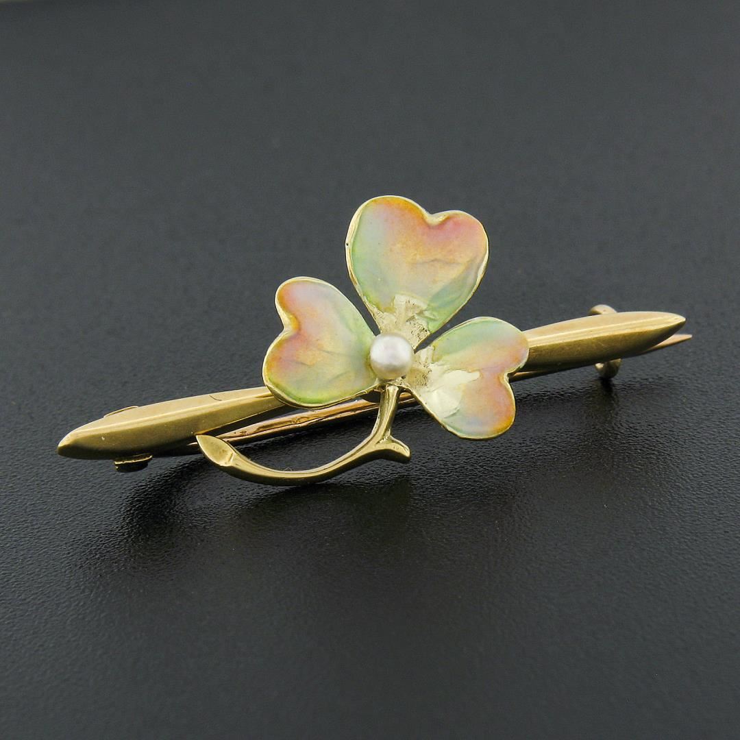 A solid 15k yellow gold brooch, with enamel work and 1 round shape cultured seed pearl (2.6mm). Measures 14.8x37mm and weighs a total of 2.21 grams.