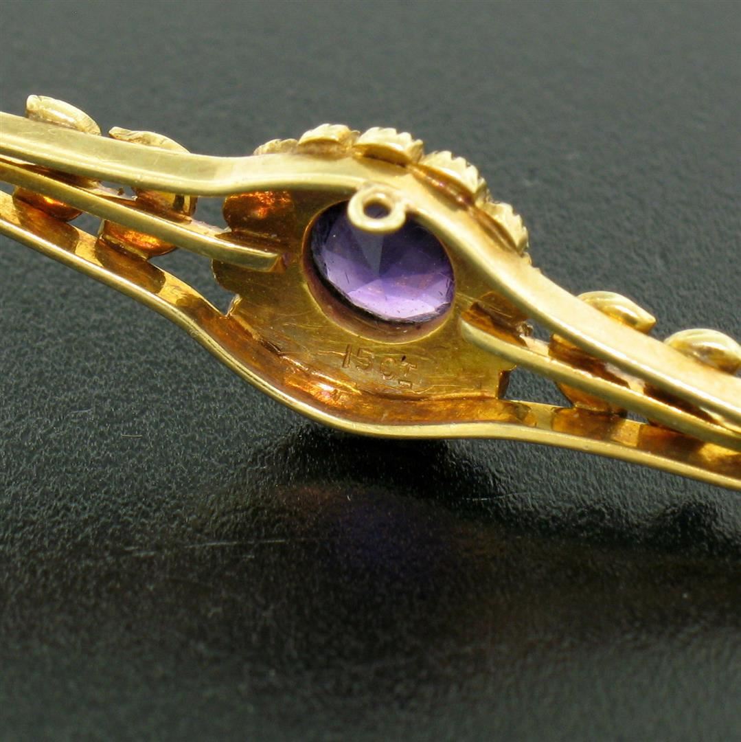 One Antique Victorian 15k Yellow Gold .64ct Old Cut Amethyst & Seed Pearl Brooch Pin. Item Details: Material: Solid 15k Yellow Gold Brooch w/ Solid 14k Yellow Gold Pin and Closure, Weight: 4.1 Grams, Stone(s): (1) Natural Genuine Amethyst - Old Round Cut - Bezel Set - Rich Royal Purple Color - 5.8mm - 0.64ct (approx.), (24) Genuine Seed Pearls - Round Shape - Bezel and Pavé Set - Creamy White to Champagne Colors - Slight Pink Overtones - Very Nice Luster - 1.0 to 1.5mm (approx.), Overall Height: 11.27mm, Overall Width: 47.96mm, Overall Thickness: 5.81mm, Condition: Antique, Victorian era piece. 15k yellow gold brooch with newer 14k yellow gold pin and closure. Excellent condition!