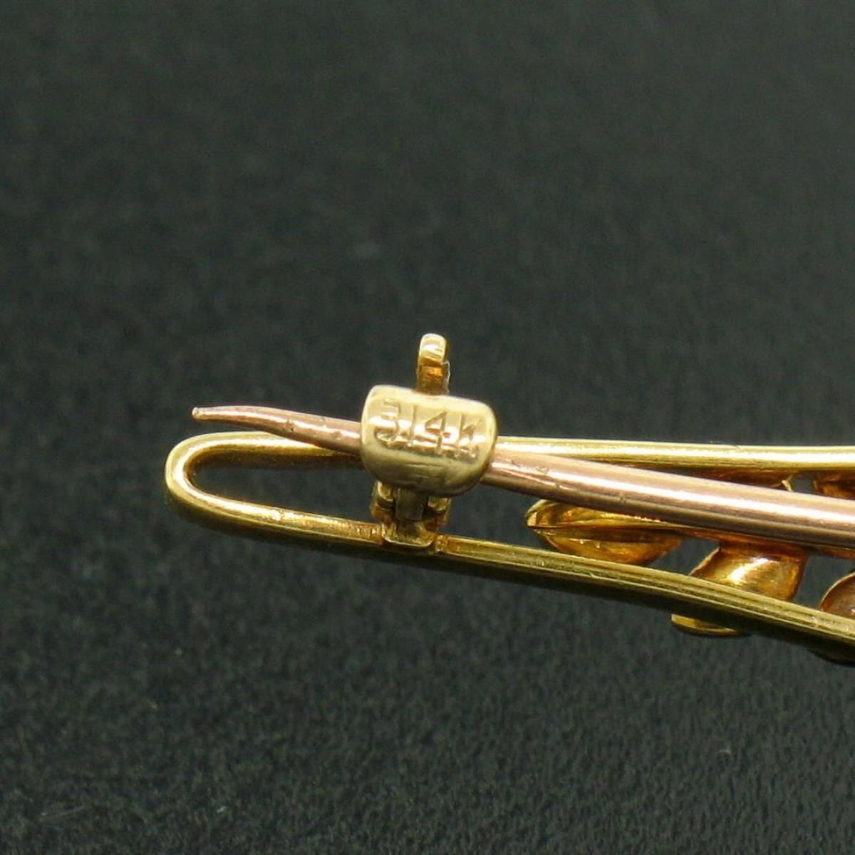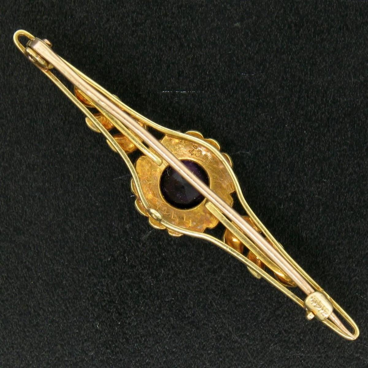 One Antique Victorian 15k Yellow Gold .64ct Old Cut Amethyst & Seed Pearl Brooch Pin. Item Details: Material: Solid 15k Yellow Gold Brooch w/ Solid 14k Yellow Gold Pin and Closure, Weight: 4.1 Grams, Stone(s): (1) Natural Genuine Amethyst - Old Round Cut - Bezel Set - Rich Royal Purple Color - 5.8mm - 0.64ct (approx.), (24) Genuine Seed Pearls - Round Shape - Bezel and Pavé Set - Creamy White to Champagne Colors - Slight Pink Overtones - Very Nice Luster - 1.0 to 1.5mm (approx.), Overall Height: 11.27mm, Overall Width: 47.96mm, Overall Thickness: 5.81mm, Condition: Antique, Victorian era piece. 15k yellow gold brooch with newer 14k yellow gold pin and closure. Excellent condition!
