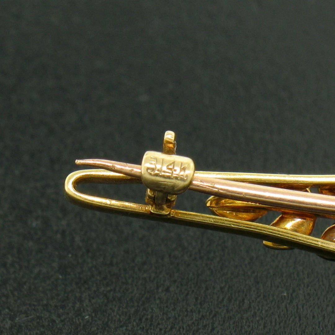 One Antique Victorian 15k Yellow Gold .64ct Old Cut Amethyst & Seed Pearl Brooch Pin. Item Details: Material: Solid 15k Yellow Gold Brooch w/ Solid 14k Yellow Gold Pin and Closure, Weight: 4.1 Grams, Stone(s): (1) Natural Genuine Amethyst - Old Round Cut - Bezel Set - Rich Royal Purple Color - 5.8mm - 0.64ct (approx.), (24) Genuine Seed Pearls - Round Shape - Bezel and Pavé Set - Creamy White to Champagne Colors - Slight Pink Overtones - Very Nice Luster - 1.0 to 1.5mm (approx.), Overall Height: 11.27mm, Overall Width: 47.96mm, Overall Thickness: 5.81mm, Condition: Antique, Victorian era piece. 15k yellow gold brooch with newer 14k yellow gold pin and closure. Excellent condition!