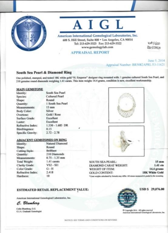 Estimated Retail Replacement Value: $29,076.00Ref: WAG11600Item no.: ARA7028 - BR5082APRLSpecification:Gold Content: Solid 18K White Gold Weight of Item: 14.40 gramsSize: 7Country Made: U.S.A Main Gemstone: South Sea PearlShape: Round-shapeQuantity: 1 countMeasurement: 15mmColor: SilverSurface Grade: ExcellentLuster: ExcellentAdjacent Gemstone: Natural Diamond Shape: Round Brilliant-cut Total Carat Weight: 1.41ctwClarity Grade: VS2 - SI1Color Grade: G – HHardness: 10 Great Condition - Shipping notes: We ship 4-10 Business day after the clearance of payment. Tracking numbers are emailed once the package(s) are shipped. Most shipments are sent by FEDEX Priority, UPS Priority, or US PRIORITY MAIL INSURED