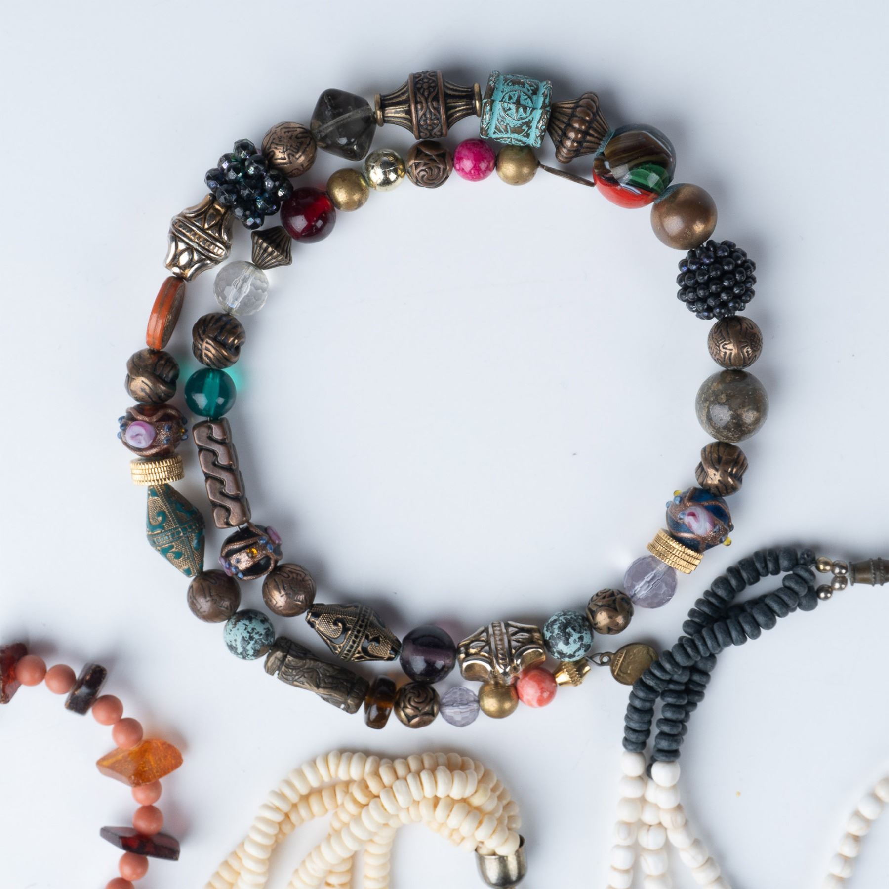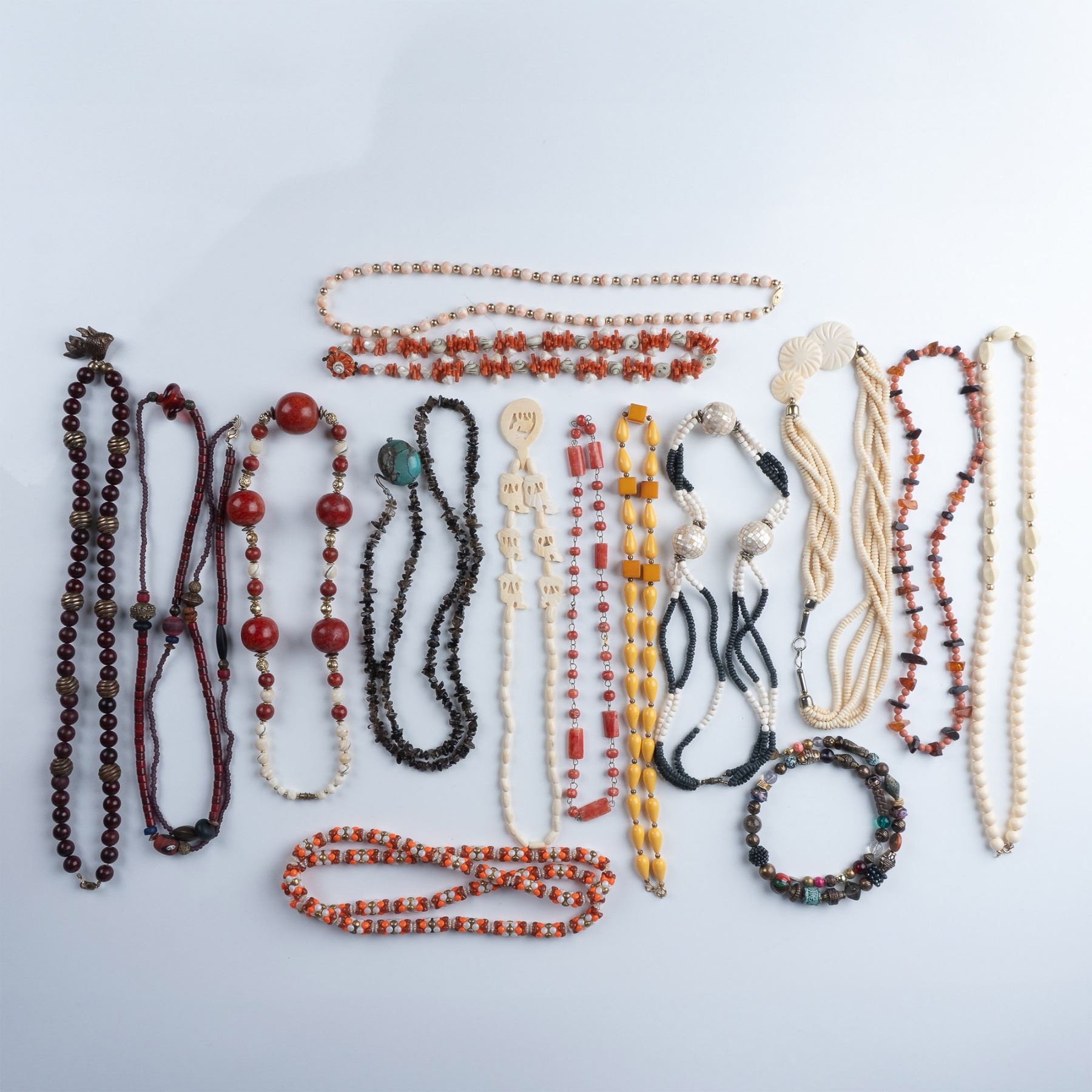 This lot features 15 unique beaded necklaces, expertly crafted with a variety of materials such as turquoise, coral, bone, and other natural and synthetic beads. The designs showcase diverse bead shapes, including round, cylindrical, and faceted, along with bold accents like large turquoise pendants and colorful bead combinations. These necklaces exhibit intricate craftsmanship and striking color patterns, offering a vibrant and eclectic assortment suitable for both casual and statement wear. This collection is perfect for jewelry enthusiasts seeking one-of-a-kind pieces with a distinctive style. Longest necklace measures: 26.5"L.