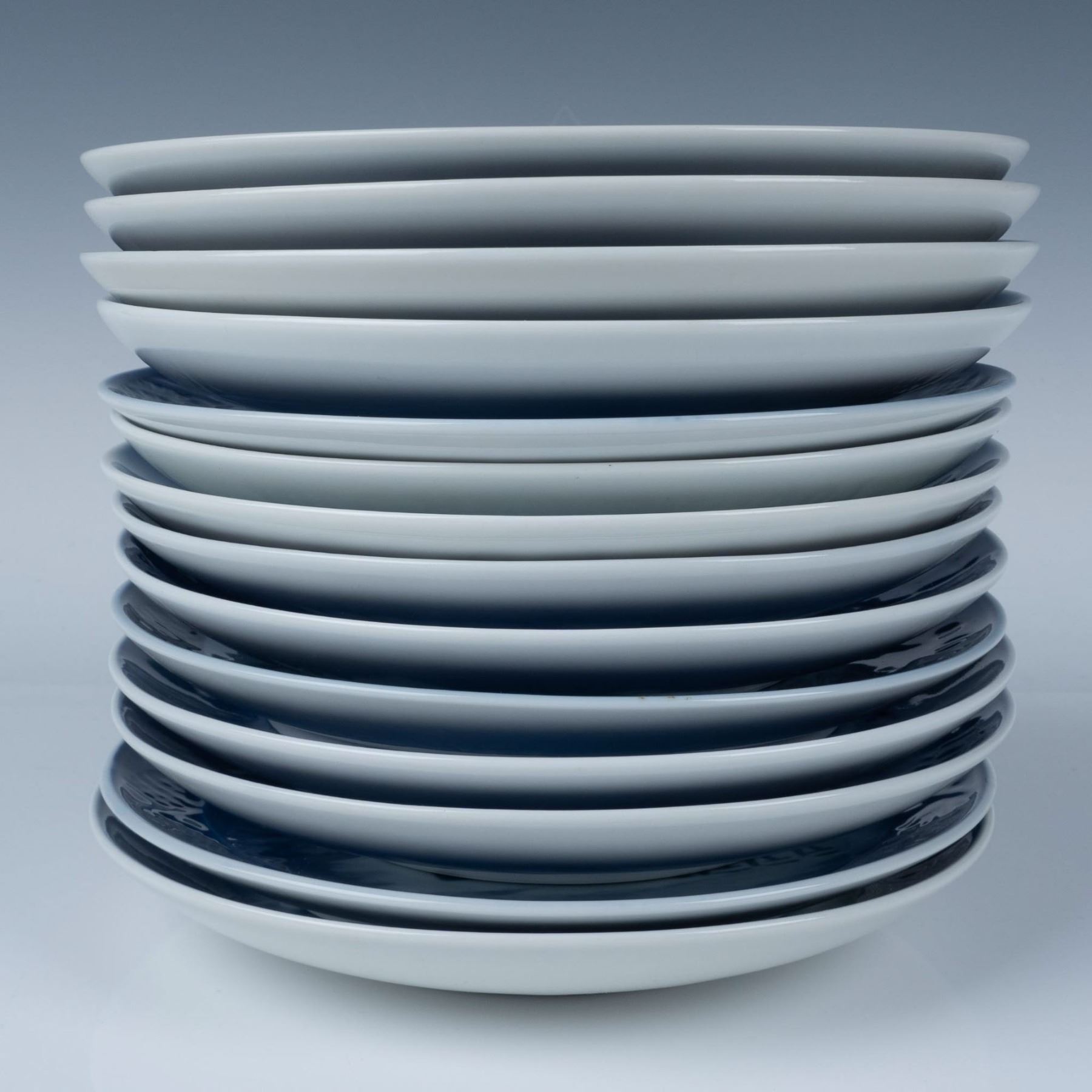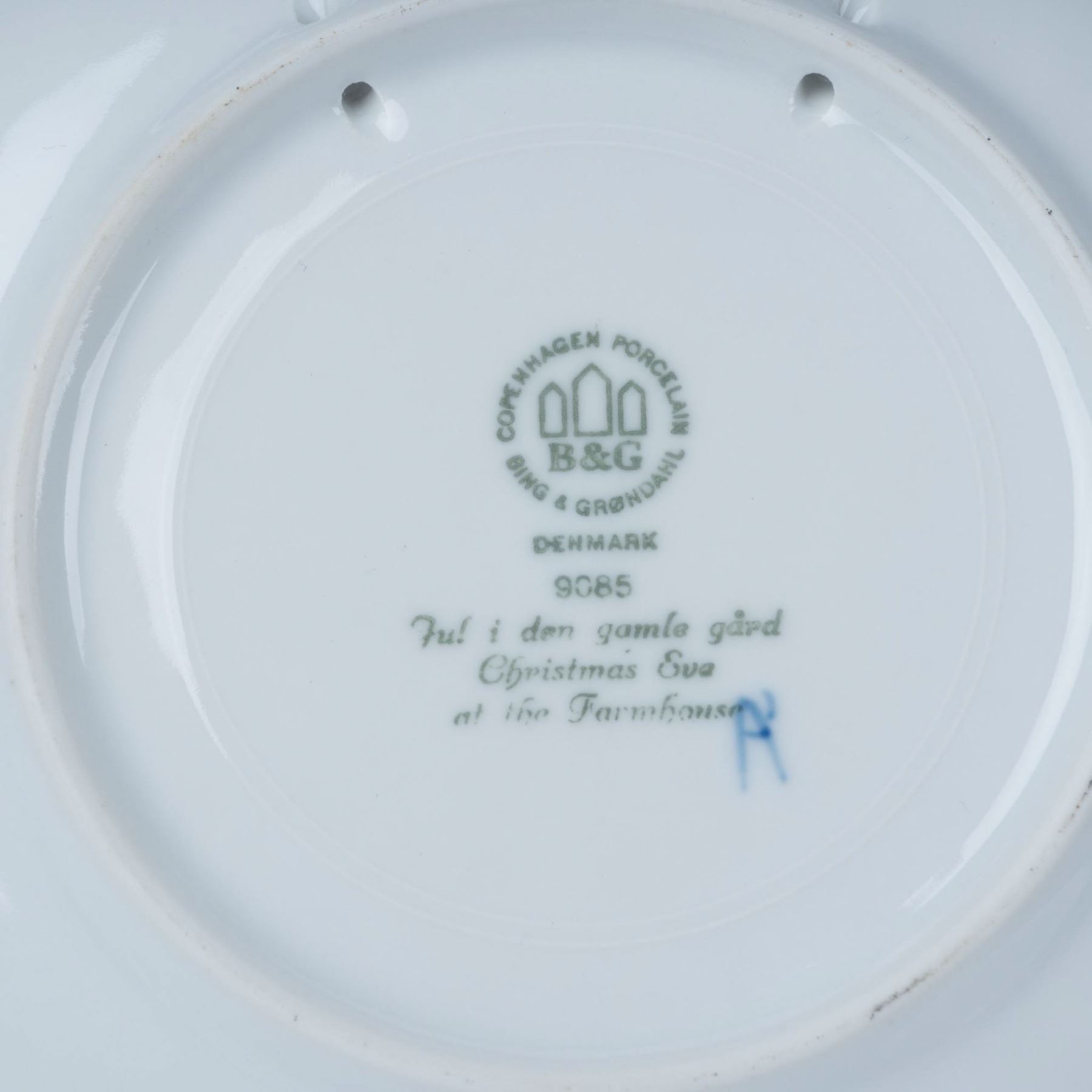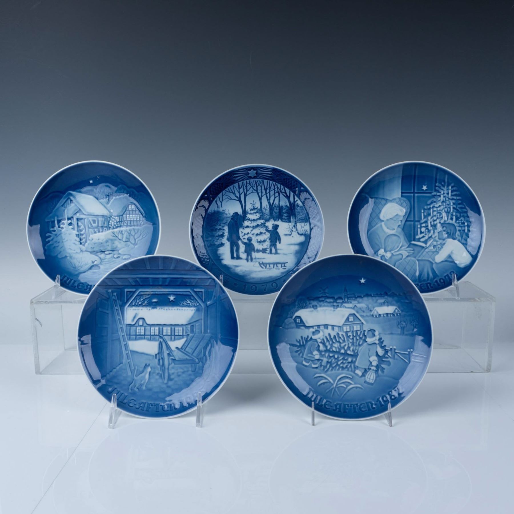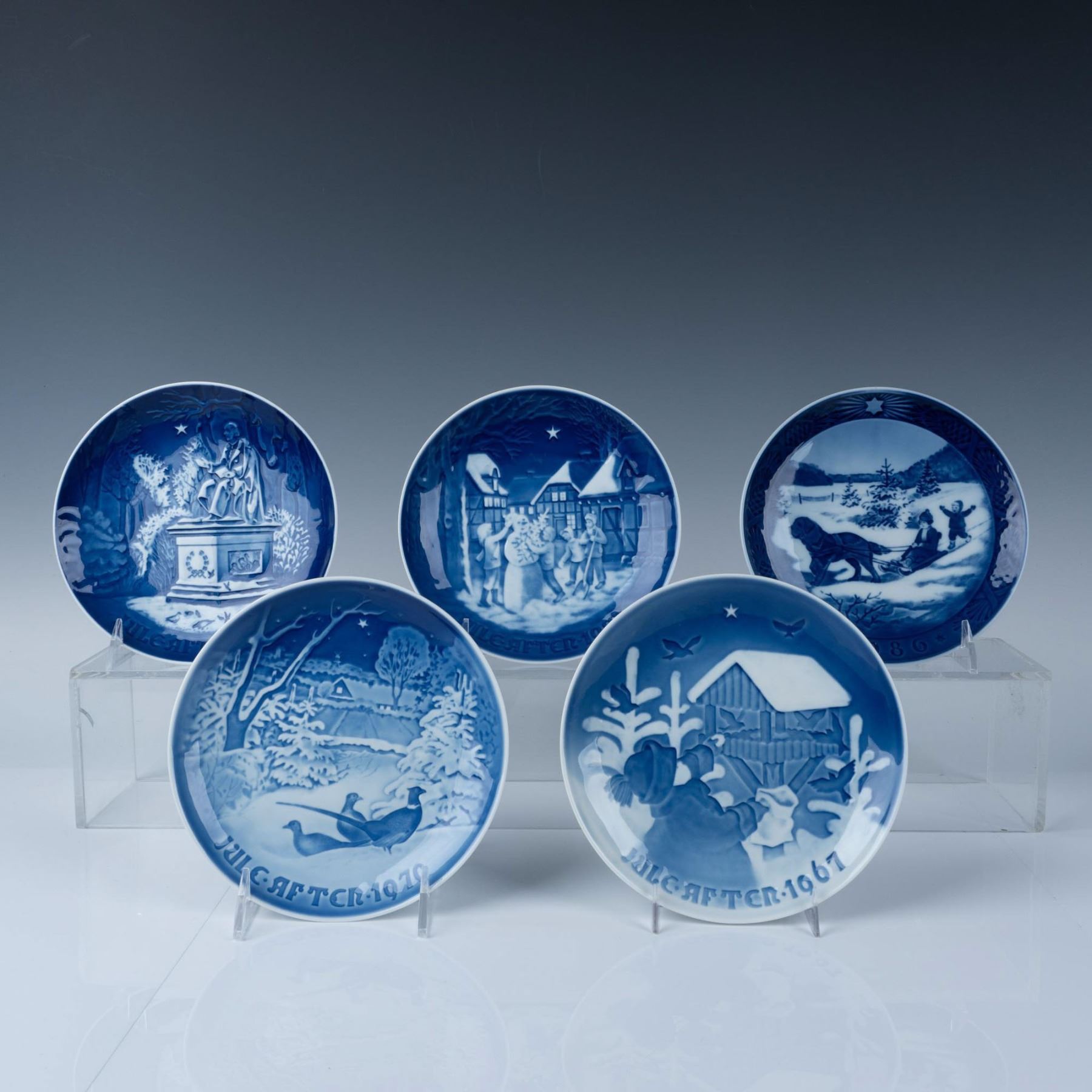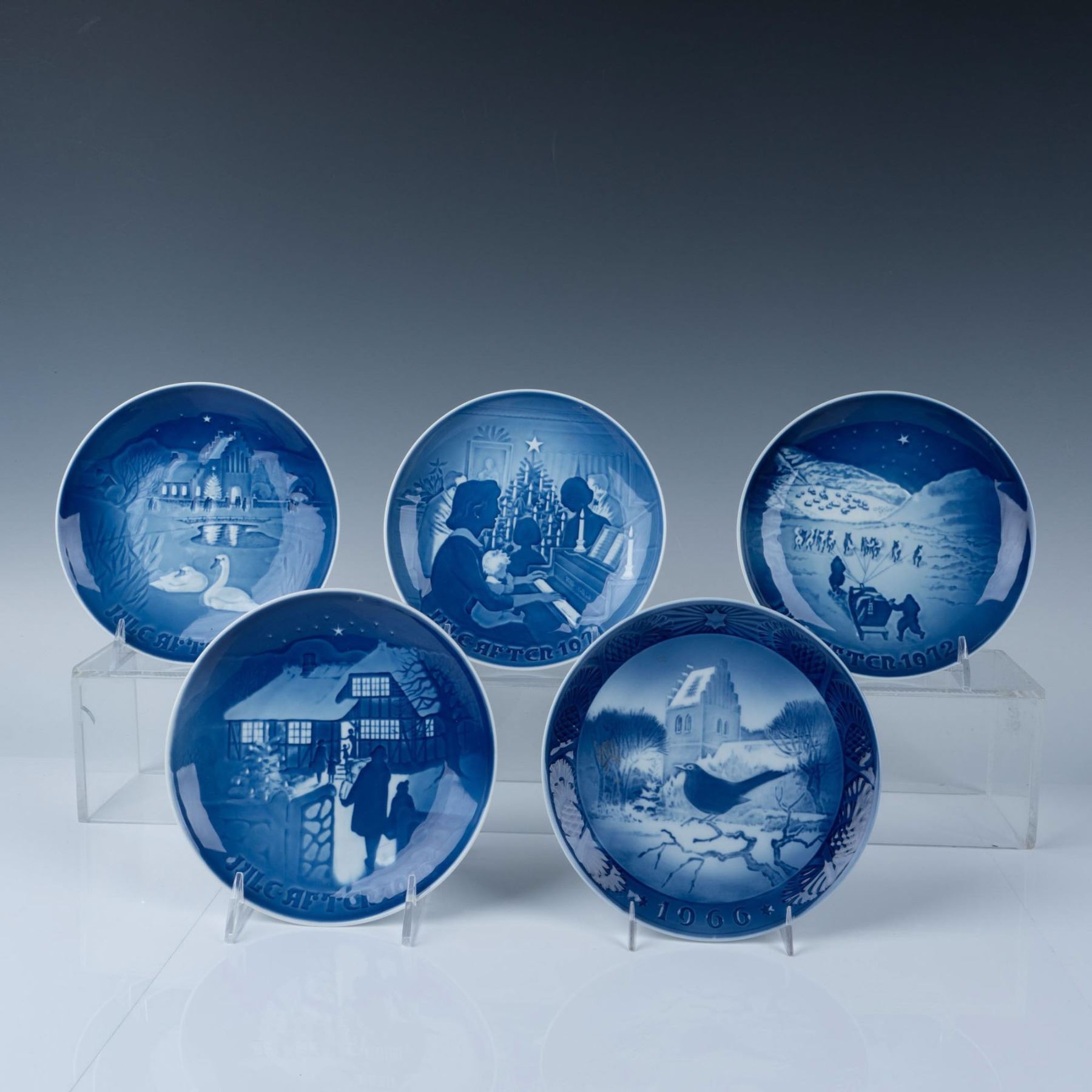 A set of 15 blue porcelain plates featuring winter and holiday scenes, with people joyfully embracing the season, animals peacefully nestled in serene landscapes, and stunning architecture. Includes years 1966, 1967, 1970, 1971, 1972, 1973, 1974, 1975, 1978, 1979, 1982, 1985, 1986, 1987, 1988. Bing and Grondahl backstamp. Dimensions of the plates: 1"H x 7" dia.