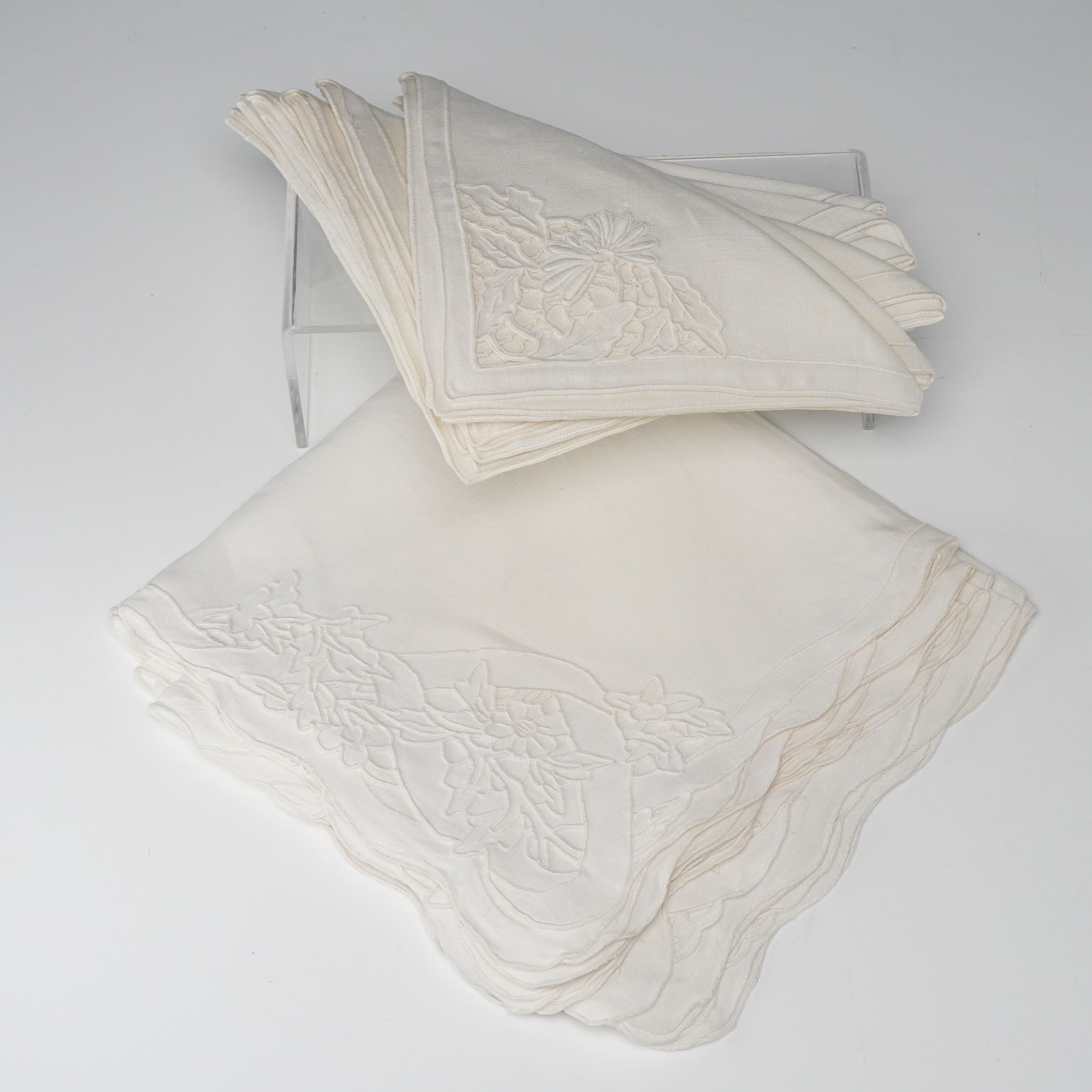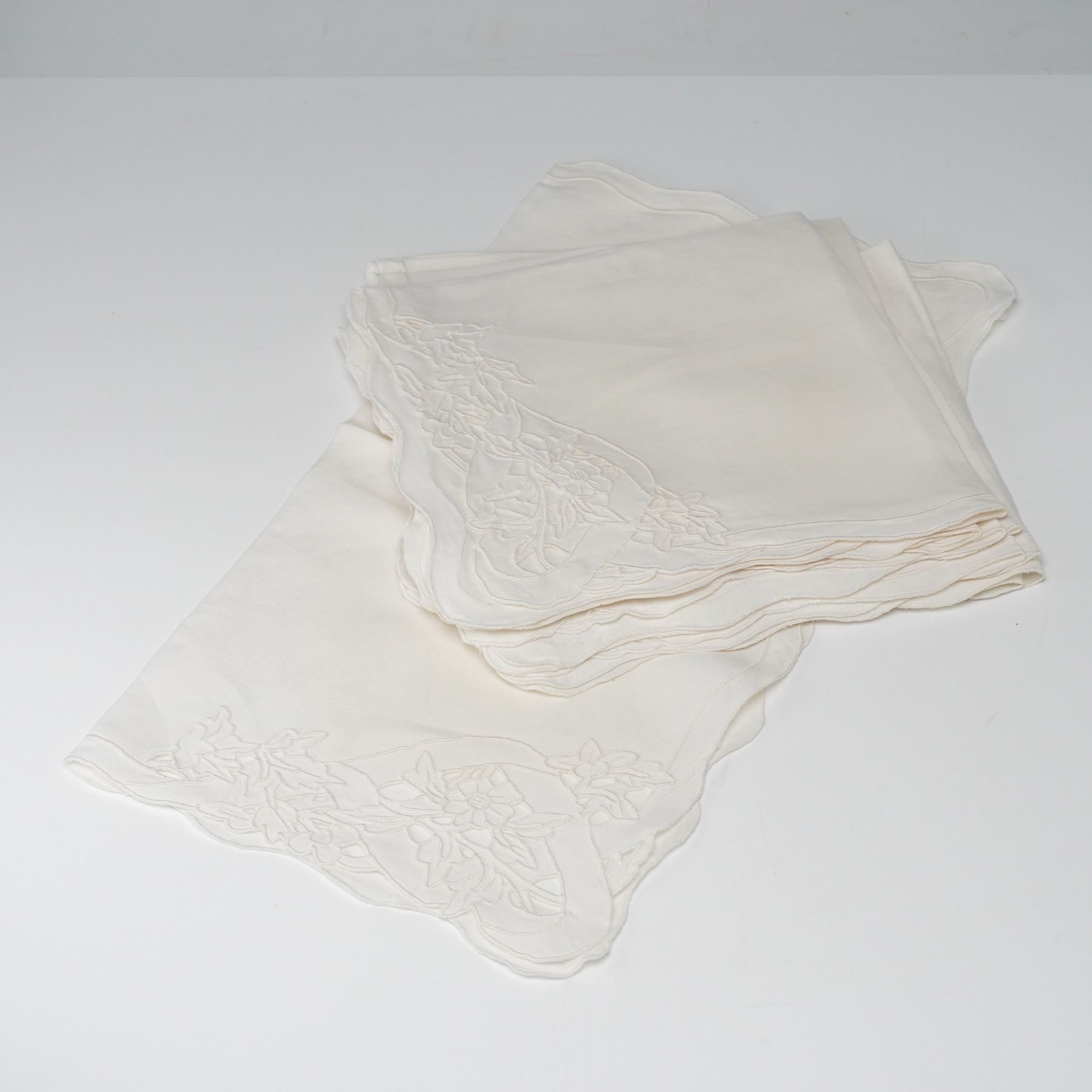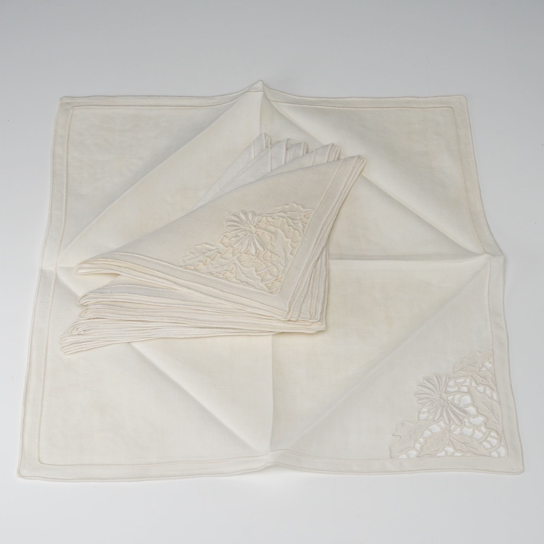 A lovely set in two sizes, including eight measuring approximately 13 inches and seven measuring approximately 16 inches. Each napkin is finely crafted in soft ivory-toned linen and features delicate floral embroidery with cutwork accents at one corner. The edges are neatly hemmed with subtle scalloping, showcasing timeless hand-finished quality. Perfect for elegant dining or vintage textile collections.