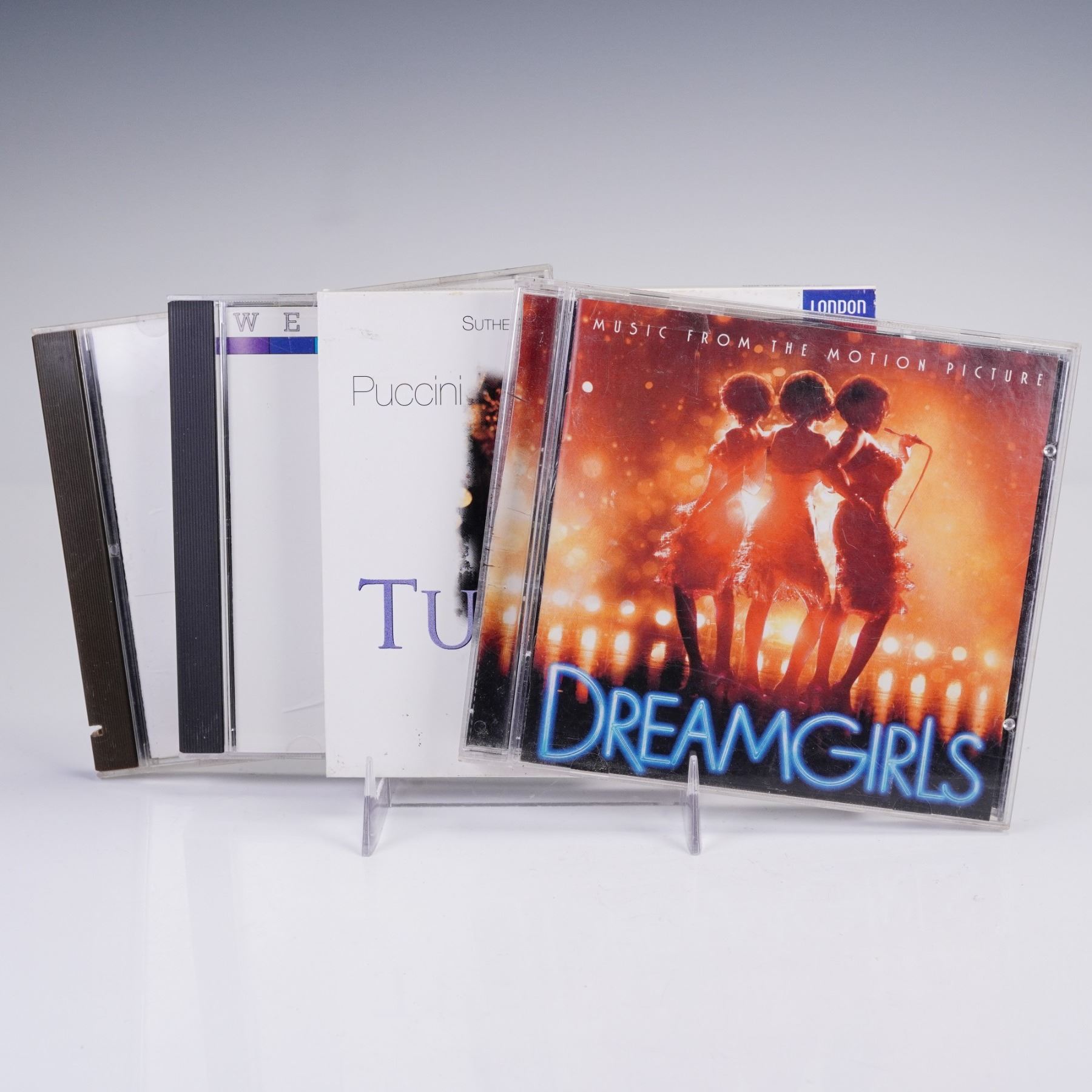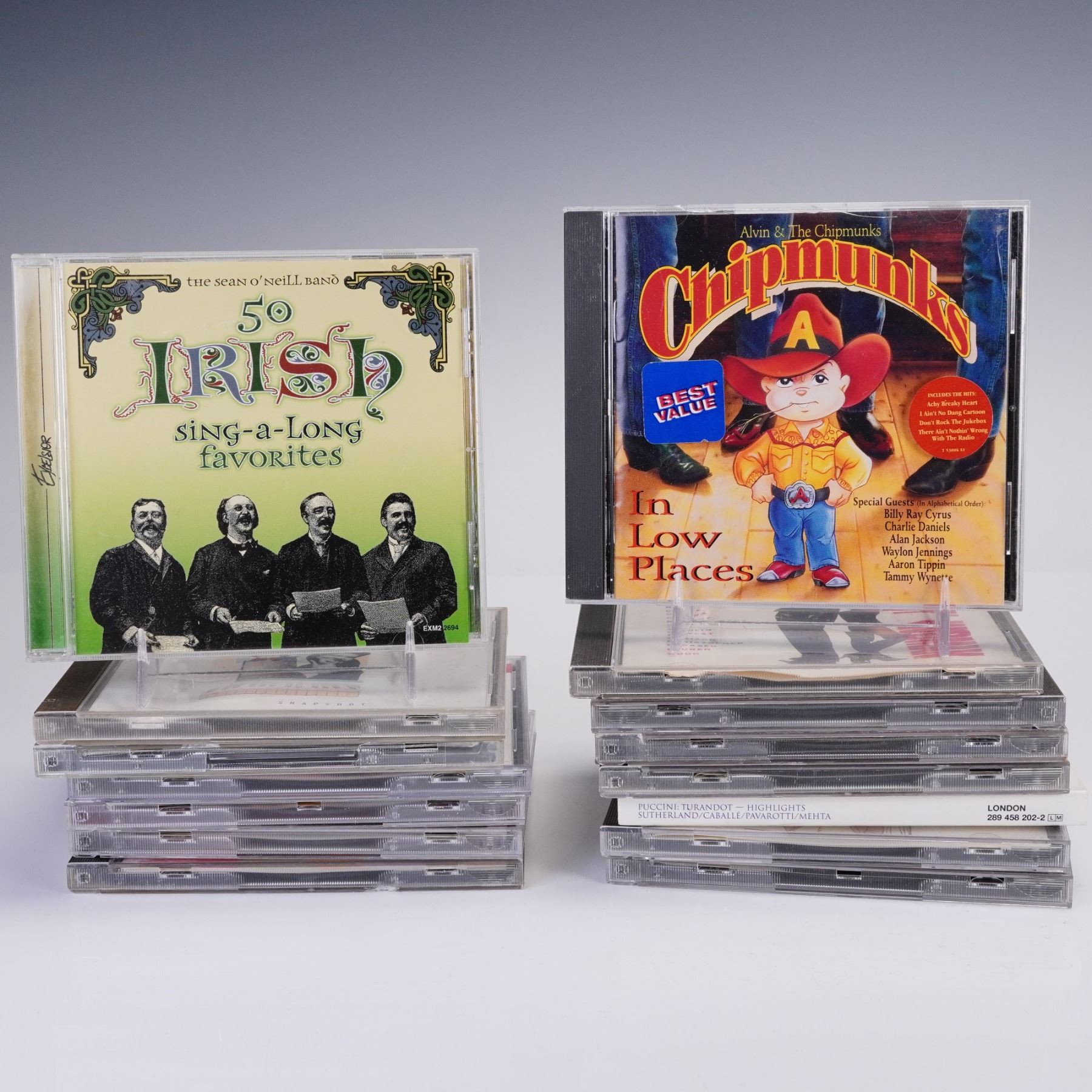 A collection of fifteen compact discs featuring a mix of opera highlights and popular motion picture soundtracks. Includes titles such as Dreamgirls music from the motion picture, 50 Irish Sing-a-Long Favorites by The Sean O'Neill Band, Alvin and the Chipmunks In Low Places with guest appearances, and Puccini's Turandot highlights. Additional discs feature classical works and soundtracks from various films and artists. Lot measures 5"L x 5.5"W x 6"H.