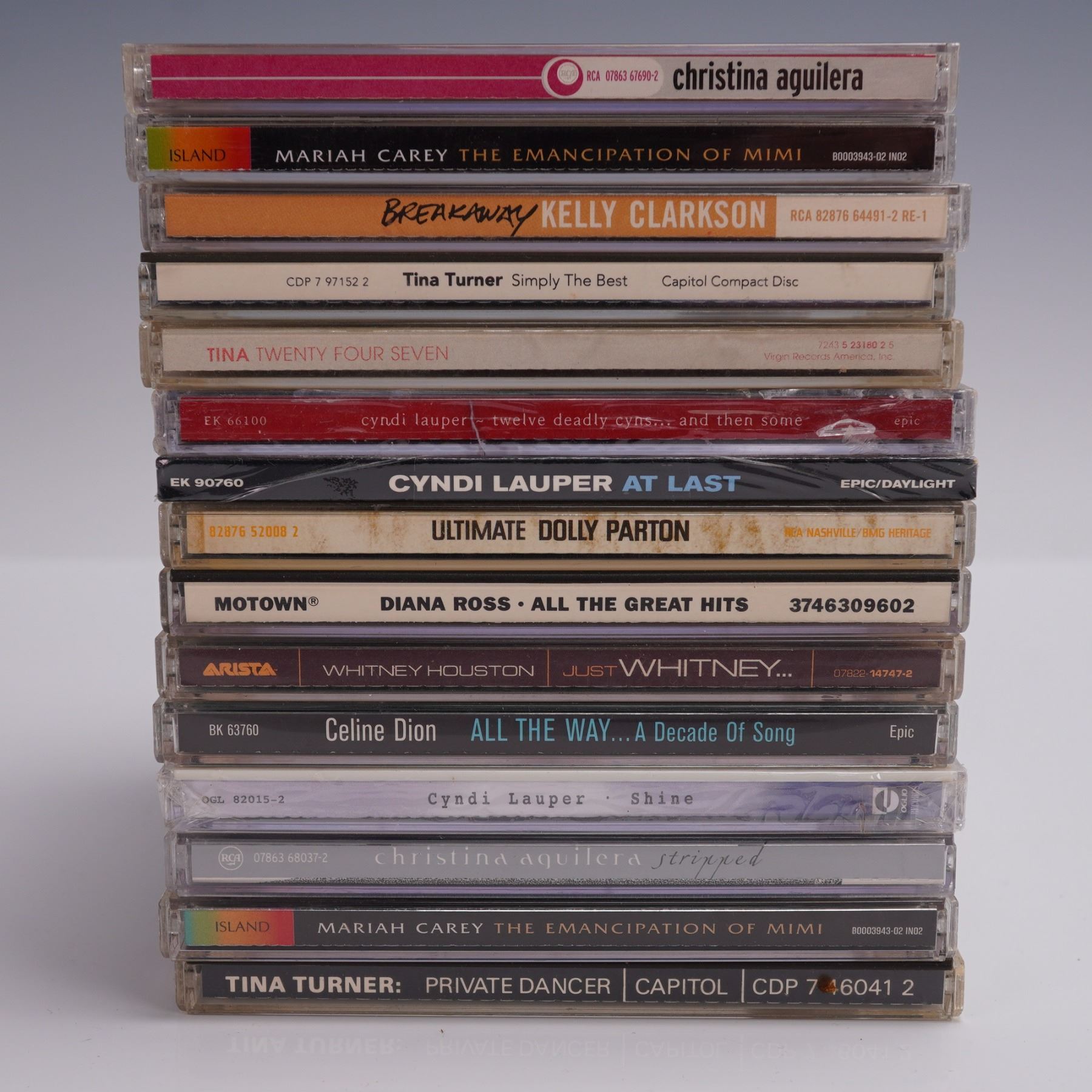 Fifteen piece CD collection spotlighting powerhouse female vocalists and pop icons. Includes multiple albums by Mariah Carey such as The Emancipation of Mimi, Tina Turner titles including Simply the Best and Private Dancer, and Cyndi Lauper with At Last, Shine, and Twelve Deadly Cyns... And Then Some. Also featured are Breakaway by Kelly Clarkson, Stripped and Christina Aguilera by Christina Aguilera, Just Whitney by Whitney Houston, All the Way... A Decade of Song by Celine Dion, and Ultimate Dolly Parton. The collection also includes Diana Ross - All the Great Hits and Tina - Twenty Four Seven. Each case measures approximately 5.75"L x 5"H.