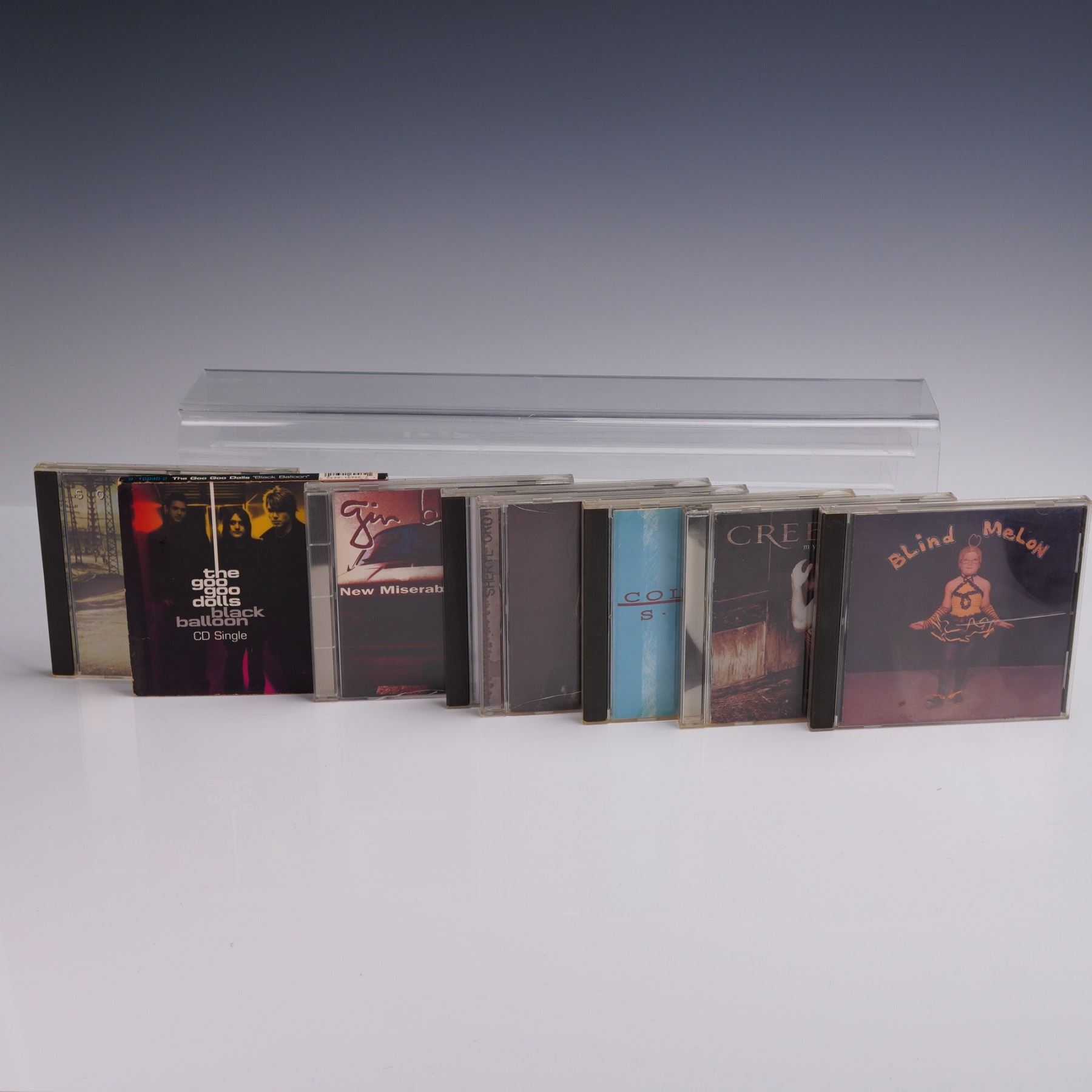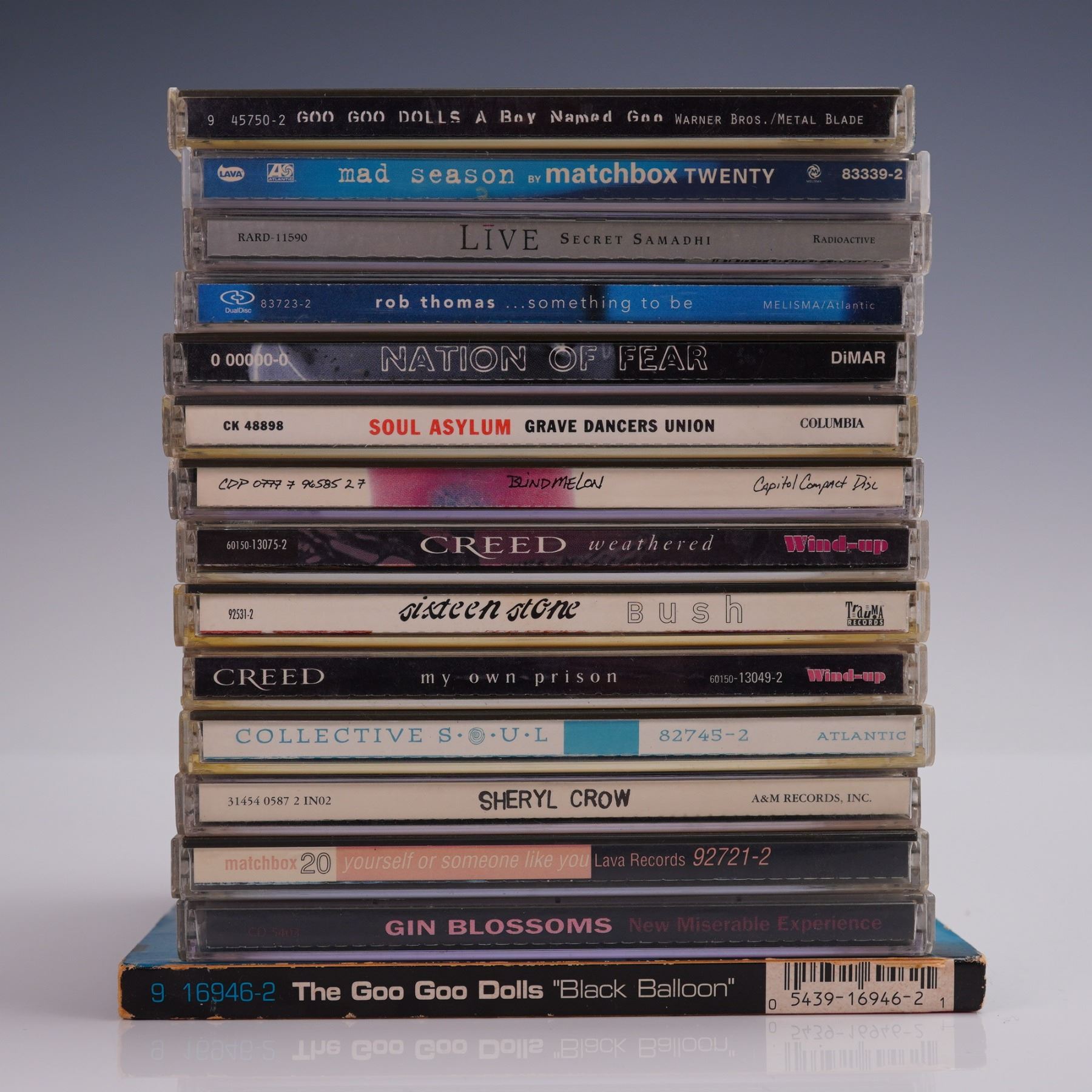 This 15-piece CD lot includes a mix of 1990s and early 2000s rock, alternative, and post-grunge albums from major artists including Goo Goo Dolls, Creed, Soul Asylum, Collective Soul, Bush, Rob Thomas, Live, Matchbox Twenty, Blind Melon, Sheryl Crow, and Gin Blossoms. Also includes a 1996 pressing of Nation of Fear on Dimar Productions and a Goo Goo Dolls Black Balloon CD single. A solid collection for fans of radio-friendly rock and alternative hits from the era. Case stack measures approximately 5.75"L x 5"H.