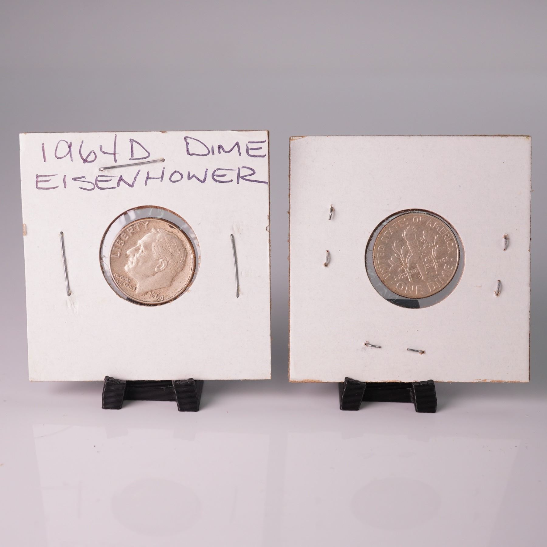This 15-piece lot consists of Roosevelt dimes dated 1964 and 1964D, each housed in a 2x2 stapled cardboard coin holder, though some holders are mistakenly labeled as "Eisenhower." These are authentic Roosevelt dimes, not Eisenhower dollars. The obverse features the left-facing profile of President Franklin D. Roosevelt, designed by John R. Sinnock, while the reverse displays a torch flanked by an olive branch and oak branch, representing liberty, peace, and strength. All 1964-dated dimes are composed of 90 percent silver, making them desirable for both collectors and silver stackers. Each coin measures 17.9mm in diameter. Coins 1964D Lot Includes Silver