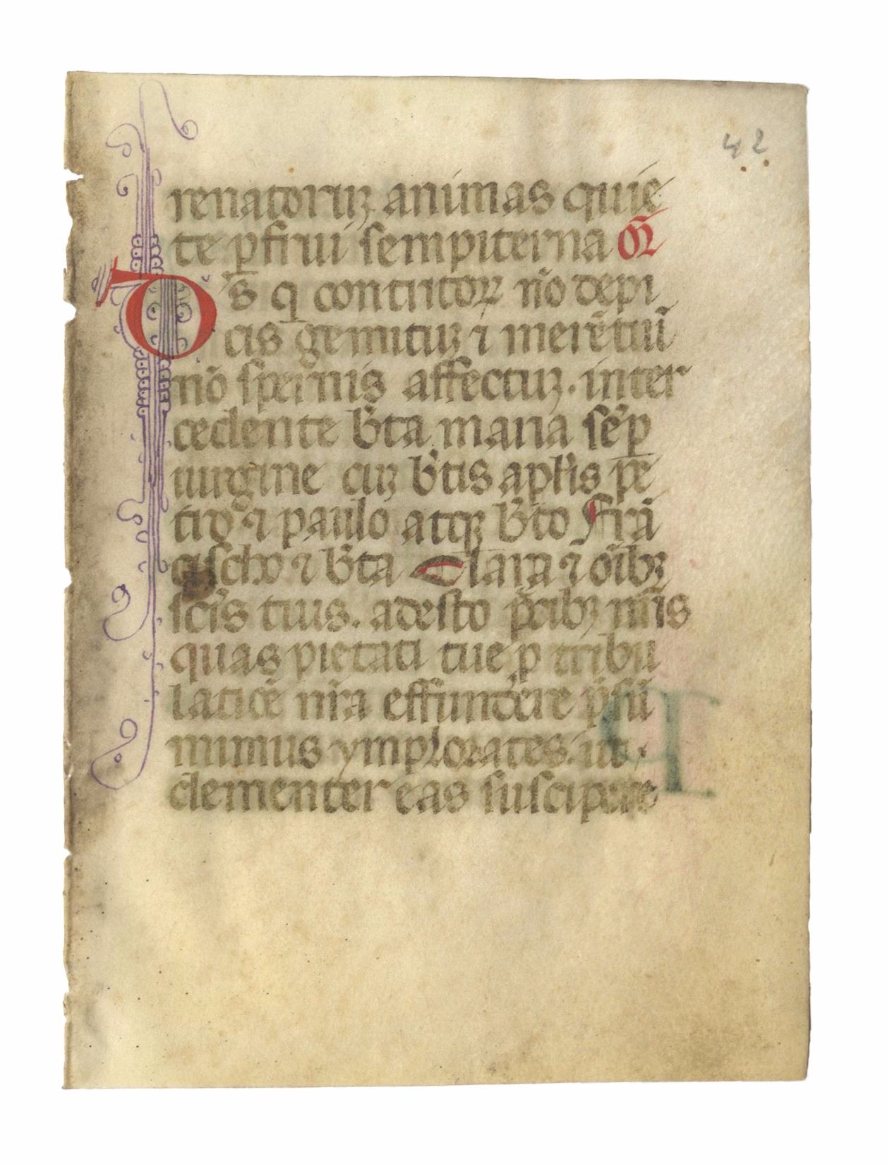 Hand-painted manuscript page from the liturgical text ''Book of Hours'', from Italy circa 1450. Double-sided vellum is beautifully rubricated in bright blue and red with long filigrees. Each side contains 14 lines of Latin text; translated words include God, Mary, Kindly, Tribulation, Father, I Pray, Everlasting and Piety. Measures 3.5'' x 4.75''. Light soiling along left edge, overall near fine given age.
