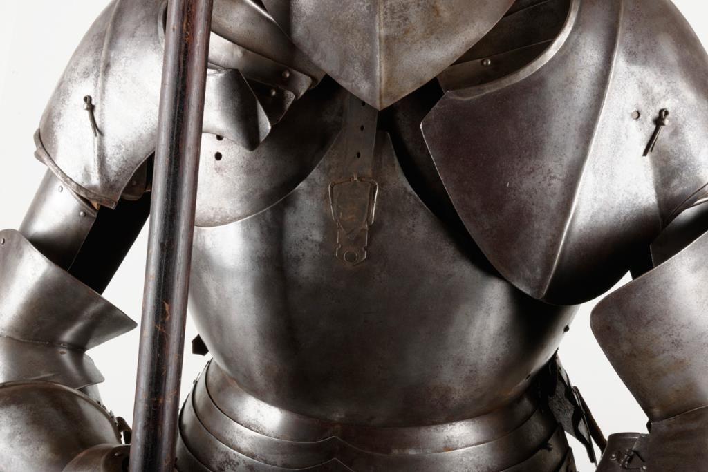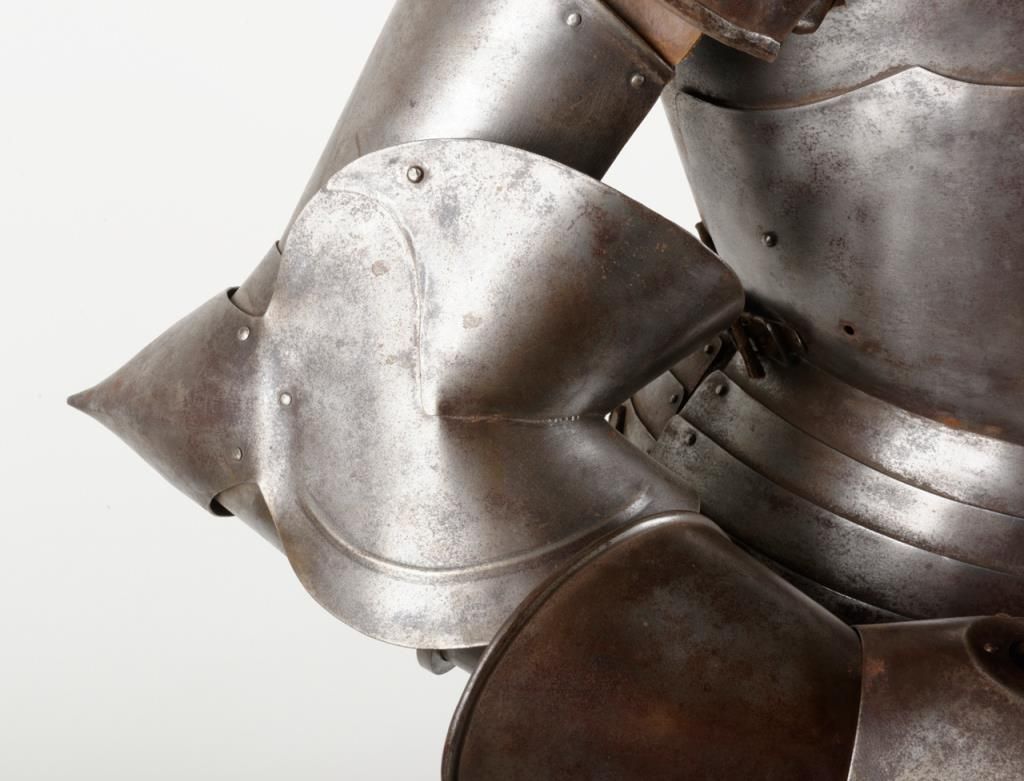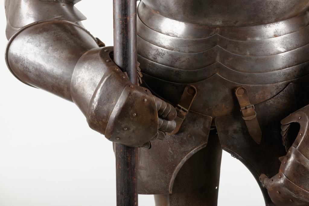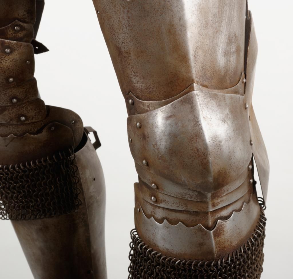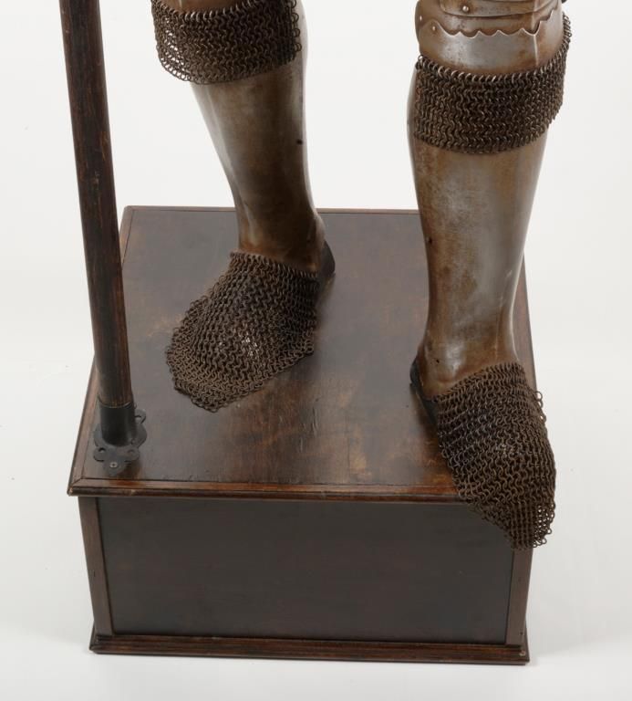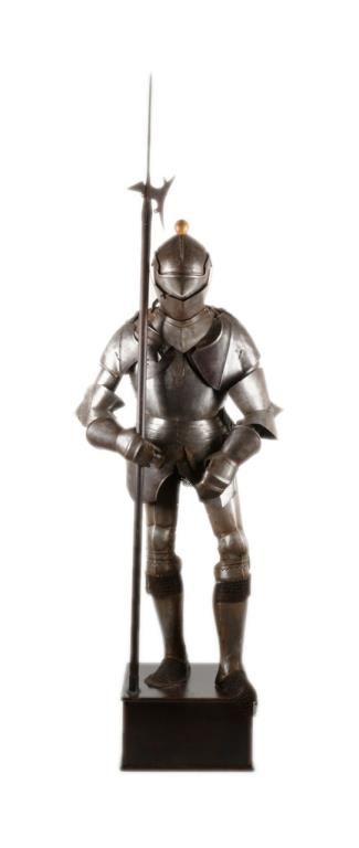 15th century style suit of armor made in the early 20th-century showing good dark patina refer to “Dexter 50 Year Scrapbook” on page 101 where it is pictured. European made 1900 to 1930s possibly in Italy. The suit is very well detailed andarticulated with good attention to form and unusual chain mail covers for foot defense. Measures 78”x30”Est.: $4000-$8000