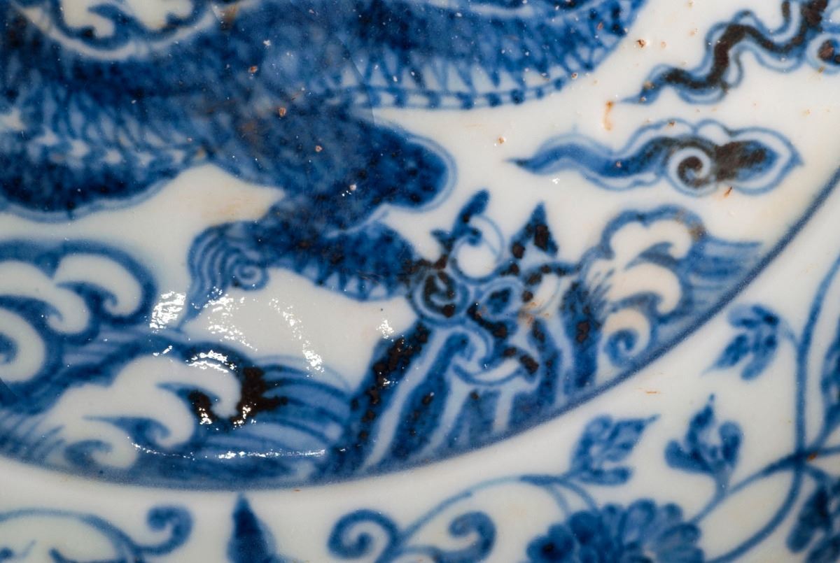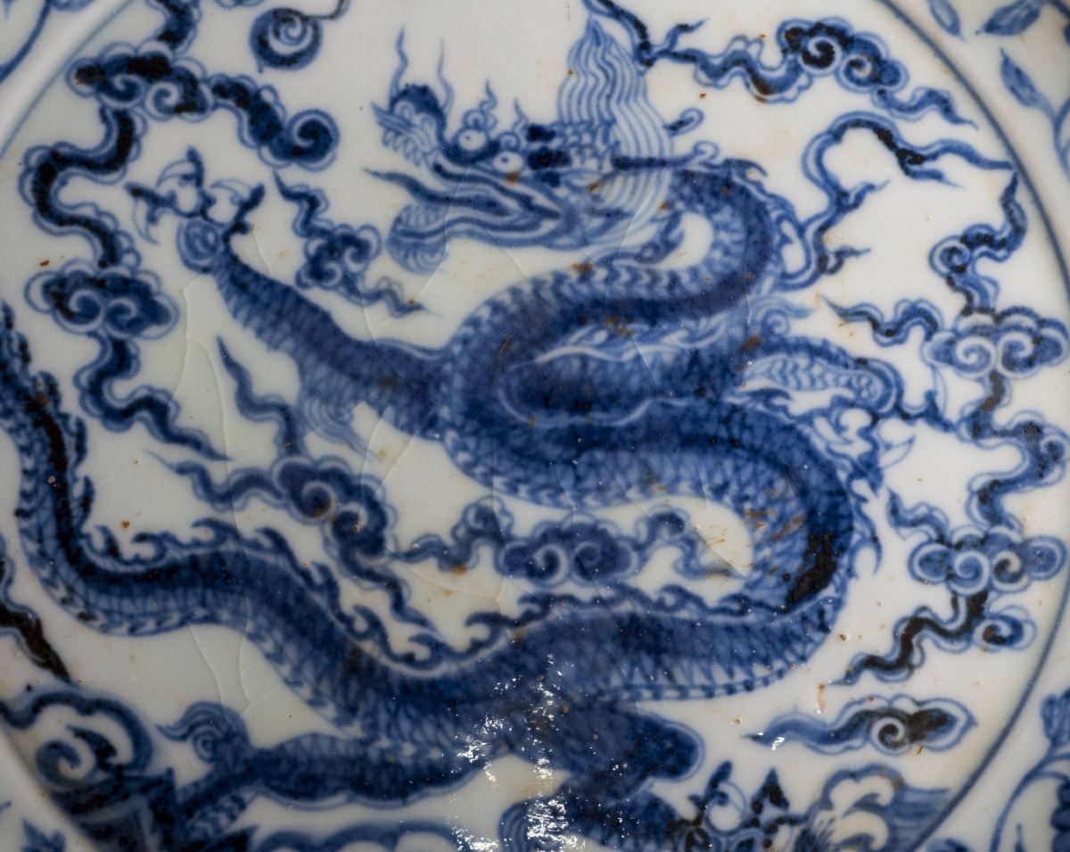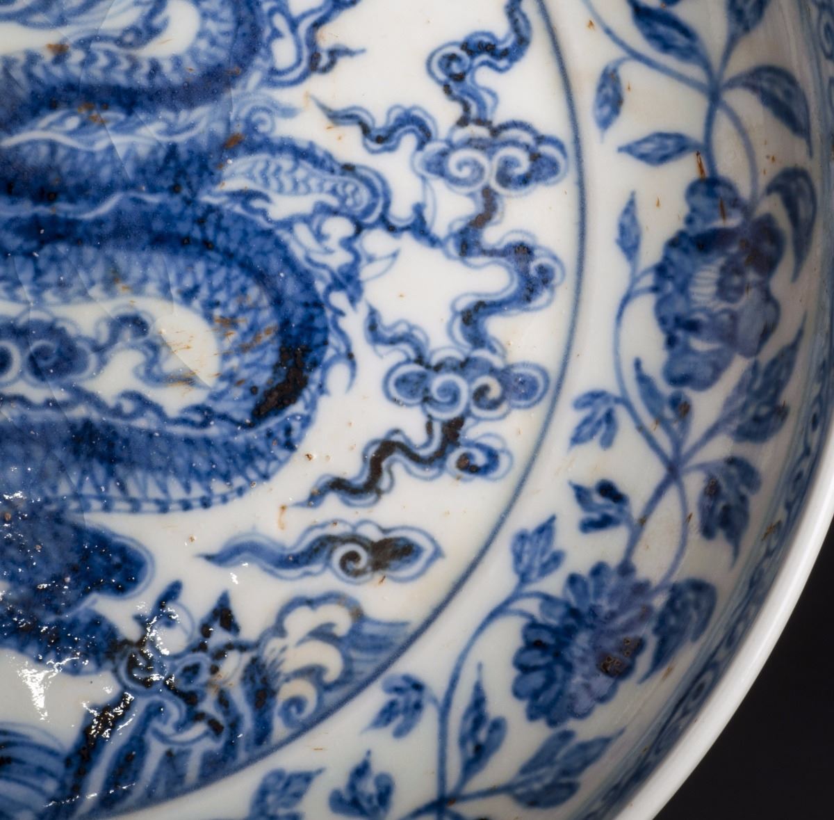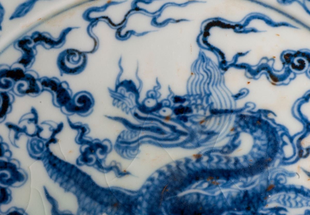Painted With The Vivid Ascending Dragon Pattern On The Main Surface, This Fine Porcelain Charger With Beautiful Blue And White Glaze Throughout, The Dragon With Vivid Under Glaze Blue Painted, With Its ClawsOpening, Face Vividly Expressed. Decorated With The Flower Band At The Edge.
