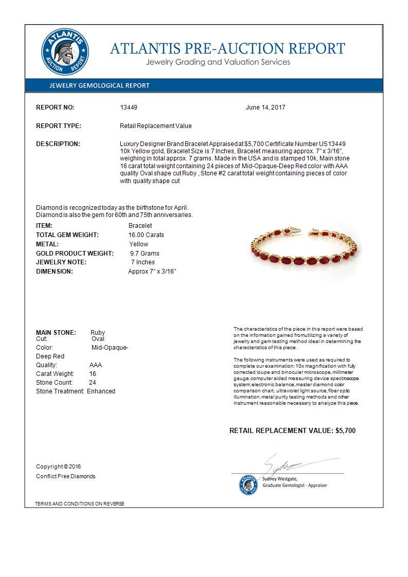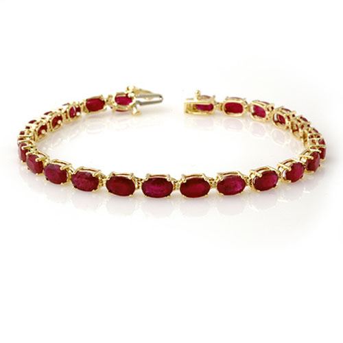 16.0 CTW Ruby Bracelet 10K Yellow Gold ---- Luxury Designer Brand Bracelet Appraised Retail Price at $5,700 ---- SKU Number US13449 10k Yellow gold Bracelet Size is 7 Inches, Bracelet measuring approx. 7" x 3/16", weighing in total approx. 7 grams. Made in the USA and is stamped 10k, Main stone 16 carat total weight containing 24 pieces of Mid-Opaque-Deep Red color with AAA quality Oval shape cut Ruby , Stone #2 carat total weight containing pieces of color with quality shape cut