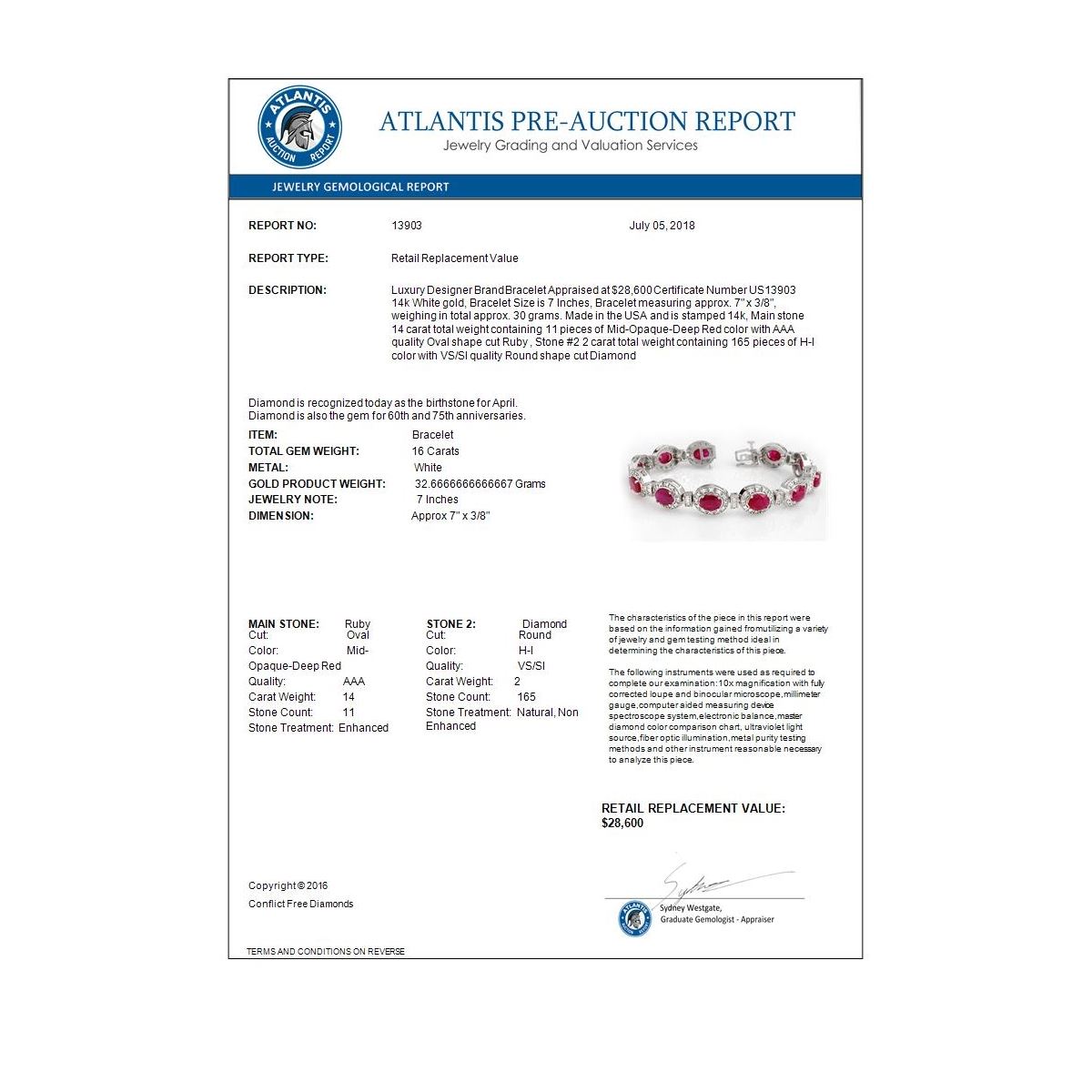 REF-400K2W -13903 ---- 16.0 CTW Ruby & Diamond Bracelet 14K White Gold ---- Luxury Designer Brand Bracelet Appraised at $28,600 Certificate Number US13903 14k White gold, Bracelet Size is 7 Inches, Bracelet measuring approx. 7" x 3/8", weighing in total approx. 30 grams. Made in the USA and is stamped 14k, Main stone 14 carat total weight containing 11 pieces of Mid-Opaque-Deep Red color with AAA quality Oval shape cut Ruby , Stone #2 2 carat total weight containing 165 pieces of H-I color with VS/SI quality Round shape cut Diamond