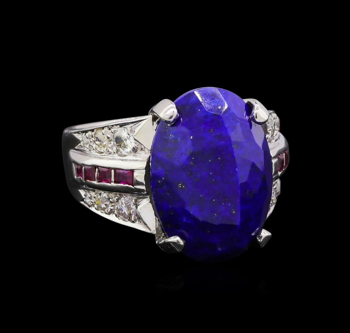 One electronically tested platinum ladies cast lapis lazuli, ruby and diamond ring with a bright polish finish. The featured lapis lazuli is supported by mirroring ruby and diamond set tapering shoulders, completed by a three and one-half millimeter wide band. Identified with markings of "PLAT". Condition is good. Containing: One prong set oval cabochon cut natural lapis lazuli, measuring 18.10 x 13.20 x 9.20mm, approximate weight of 16.00ct., dark, moderately strong, violetish blue color, (GIA vB 7/4), cut is good. Transmitting light very diffusely, opaque. Naturally occurring internal & external characteristics are present. Graded in the setting. Eight flush set square step cut natural rubies, measuring 2.30 x 1.50 x 1.24mm, approximate total weight of 0.32ct., clarity is eye clean, type II, medium dark, very slightly brownish, strongly purplish red color, (GIA stpR 6/3), cut is good. Transmitting light with no distortion, transparent. Measurements & the color grade are an average for the group. Graded in the setting. Twelve prong set Old European cut diamonds, measuring 3.00. - 1.30 x 1.34mm (depth est.) approximate total weight of 12 Stones = 0.61ct. The color grade reflects the entire range of color for this group. Cutting style circa late 19th century. Graded in the setting. Clarity: SI-2 to I-2 . Color: F - I. Total Weight of Colored Stones 16.32ct.. Total Weight of Diamonds 0.61ct.. Total Weight of Ring 13.36gm. AIG Appraised at $3,470.00.