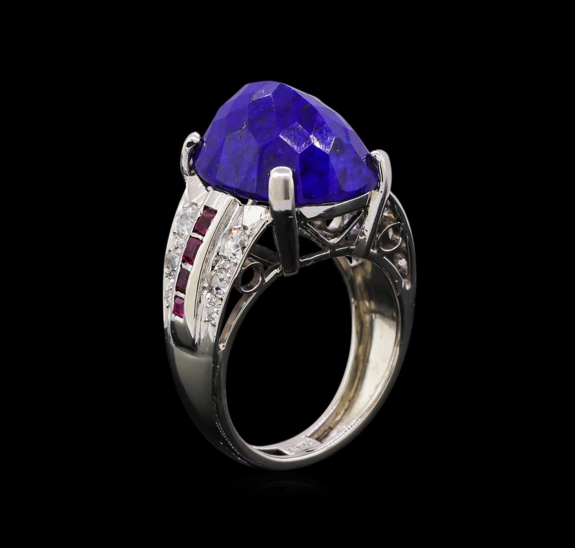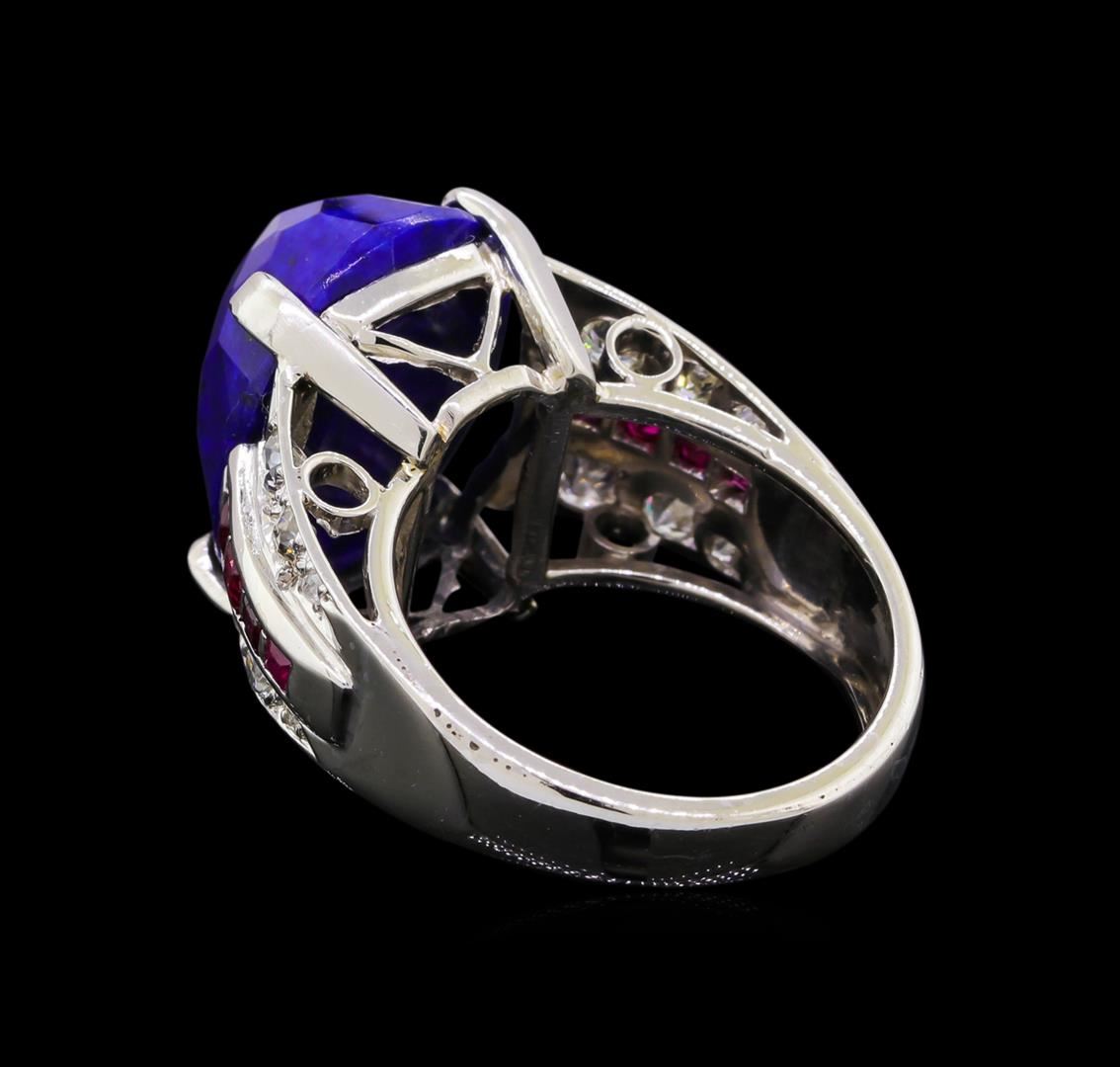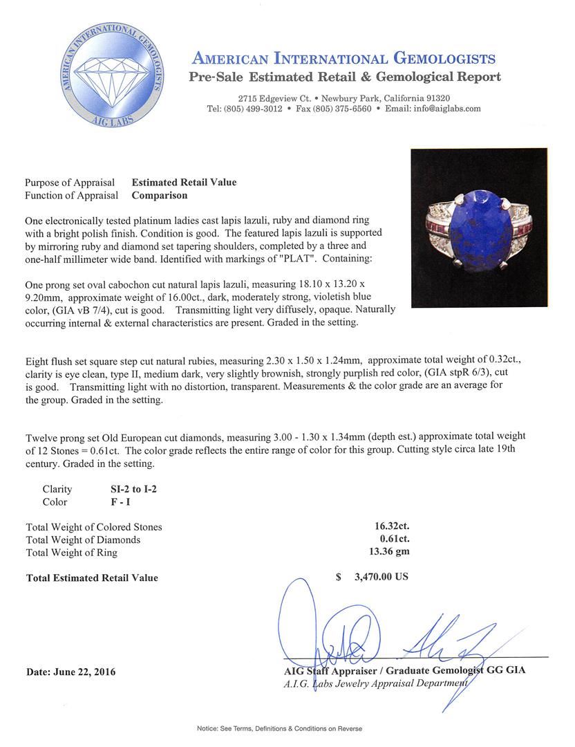 One electronically tested platinum ladies cast lapis lazuli, ruby and diamond ring with a bright polish finish. The featured lapis lazuli is supported by mirroring ruby and diamond set tapering shoulders, completed by a three and one-half millimeter wide band. Identified with markings of "PLAT". Condition is good. Containing: One prong set oval cabochon cut natural lapis lazuli, measuring 18.10 x 13.20 x 9.20mm, approximate weight of 16.00ct., dark, moderately strong, violetish blue color, (GIA vB 7/4), cut is good. Transmitting light very diffusely, opaque. Naturally occurring internal & external characteristics are present. Graded in the setting. Eight flush set square step cut natural rubies, measuring 2.30 x 1.50 x 1.24mm, approximate total weight of 0.32ct., clarity is eye clean, type II, medium dark, very slightly brownish, strongly purplish red color, (GIA stpR 6/3), cut is good. Transmitting light with no distortion, transparent. Measurements & the color grade are an average for the group. Graded in the setting. Twelve prong set Old European cut diamonds, measuring 3.00. - 1.30 x 1.34mm (depth est.) approximate total weight of 12 Stones = 0.61ct. The color grade reflects the entire range of color for this group. Cutting style circa late 19th century. Graded in the setting. Clarity: SI-2 to I-2 . Color: F - I. Total Weight of Colored Stones 16.32ct.. Total Weight of Diamonds 0.61ct.. Total Weight of Ring 13.36gm. AIG Appraised at $3,470.00.