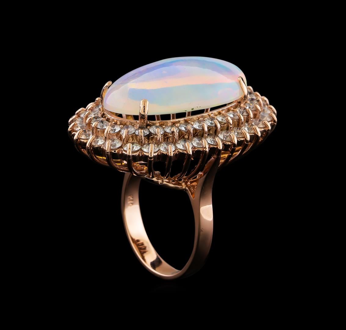 One electronically tested 14KT rose gold lady's cast fashion ring with a double basket halo with a bright polish finish. The featured lady's ring has a shank measuring 3.56 millimeters in width. Identified with markings of "K14". Condition is new, good workmanship. Containing: One crystal opal that is cut in a oval shaped cabochon and is prong set, measuring 25.98 mm long x 14.12 mm wide, and 7.00 mm thick and the approximate weight is 16.01 carats. The opal has a bright, multicolor play of color (fire) in a rolling flashfire pattern; a medium dome; a cut; no inclusions in its brightness and pattern; and is. Transmitting light with a minimum of distortion, transparent. Graded in the setting. Thirty prong set round brilliant cut diamonds, measuring 2.80 - 2.70 x 1.71mm (depth est.) approximate total weight of 30 Stones = 2.50ct. Graded in the setting. Clarity: VS-2 to SI-1. Color: H - I. Cut Good Thirty prong set round brilliant cut diamonds, measuring 2.40 - 2.30 x 1.46mm (depth est.) approximate total weight of 30 Stones = 1.56ct. Graded in the setting. Clarity: SI-1 to SI-2. Color: H - I. Cut Good. Total Weight of Diamonds 4.06ct. Total Weight of Opals 16.01ct. Total Weight of Ring 18.30gm. GAS Appraised at $14,995.00.
