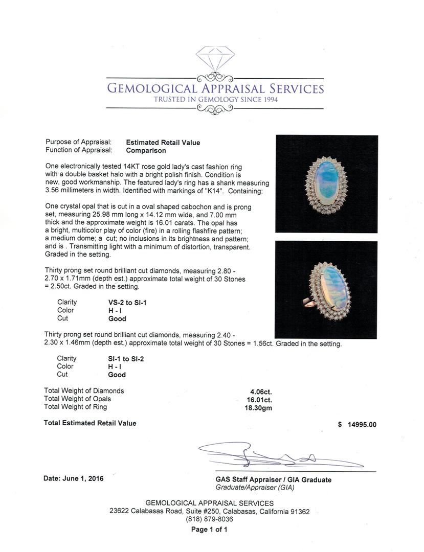 One electronically tested 14KT rose gold lady's cast fashion ring with a double basket halo with a bright polish finish. The featured lady's ring has a shank measuring 3.56 millimeters in width. Identified with markings of "K14". Condition is new, good workmanship. Containing: One crystal opal that is cut in a oval shaped cabochon and is prong set, measuring 25.98 mm long x 14.12 mm wide, and 7.00 mm thick and the approximate weight is 16.01 carats. The opal has a bright, multicolor play of color (fire) in a rolling flashfire pattern; a medium dome; a cut; no inclusions in its brightness and pattern; and is. Transmitting light with a minimum of distortion, transparent. Graded in the setting. Thirty prong set round brilliant cut diamonds, measuring 2.80 - 2.70 x 1.71mm (depth est.) approximate total weight of 30 Stones = 2.50ct. Graded in the setting. Clarity: VS-2 to SI-1. Color: H - I. Cut Good Thirty prong set round brilliant cut diamonds, measuring 2.40 - 2.30 x 1.46mm (depth est.) approximate total weight of 30 Stones = 1.56ct. Graded in the setting. Clarity: SI-1 to SI-2. Color: H - I. Cut Good. Total Weight of Diamonds 4.06ct. Total Weight of Opals 16.01ct. Total Weight of Ring 18.30gm. GAS Appraised at $14,995.00.