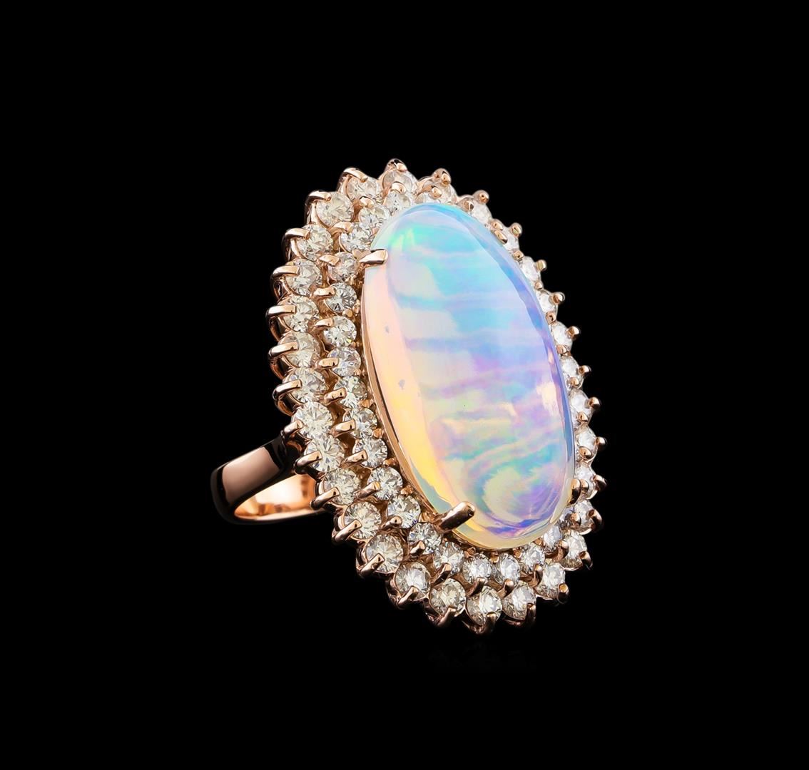 One electronically tested 14KT rose gold lady's cast fashion ring with a double basket halo with a bright polish finish. The featured lady's ring has a shank measuring 3.56 millimeters in width. Identified with markings of "K14". Condition is new, good workmanship. Containing: One crystal opal that is cut in a oval shaped cabochon and is prong set, measuring 25.98 mm long x 14.12 mm wide, and 7.00 mm thick and the approximate weight is 16.01 carats. The opal has a bright, multicolor play of color (fire) in a rolling flashfire pattern; a medium dome; a cut; no inclusions in its brightness and pattern; and is. Transmitting light with a minimum of distortion, transparent. Graded in the setting. Thirty prong set round brilliant cut diamonds, measuring 2.80 - 2.70 x 1.71mm (depth est.) approximate total weight of 30 Stones = 2.50ct. Graded in the setting. Clarity: VS-2 to SI-1. Color: H - I. Cut Good Thirty prong set round brilliant cut diamonds, measuring 2.40 - 2.30 x 1.46mm (depth est.) approximate total weight of 30 Stones = 1.56ct. Graded in the setting. Clarity: SI-1 to SI-2. Color: H - I. Cut Good. Total Weight of Diamonds 4.06ct. Total Weight of Opals 16.01ct. Total Weight of Ring 18.30gm. GAS Appraised at $14,995.00.