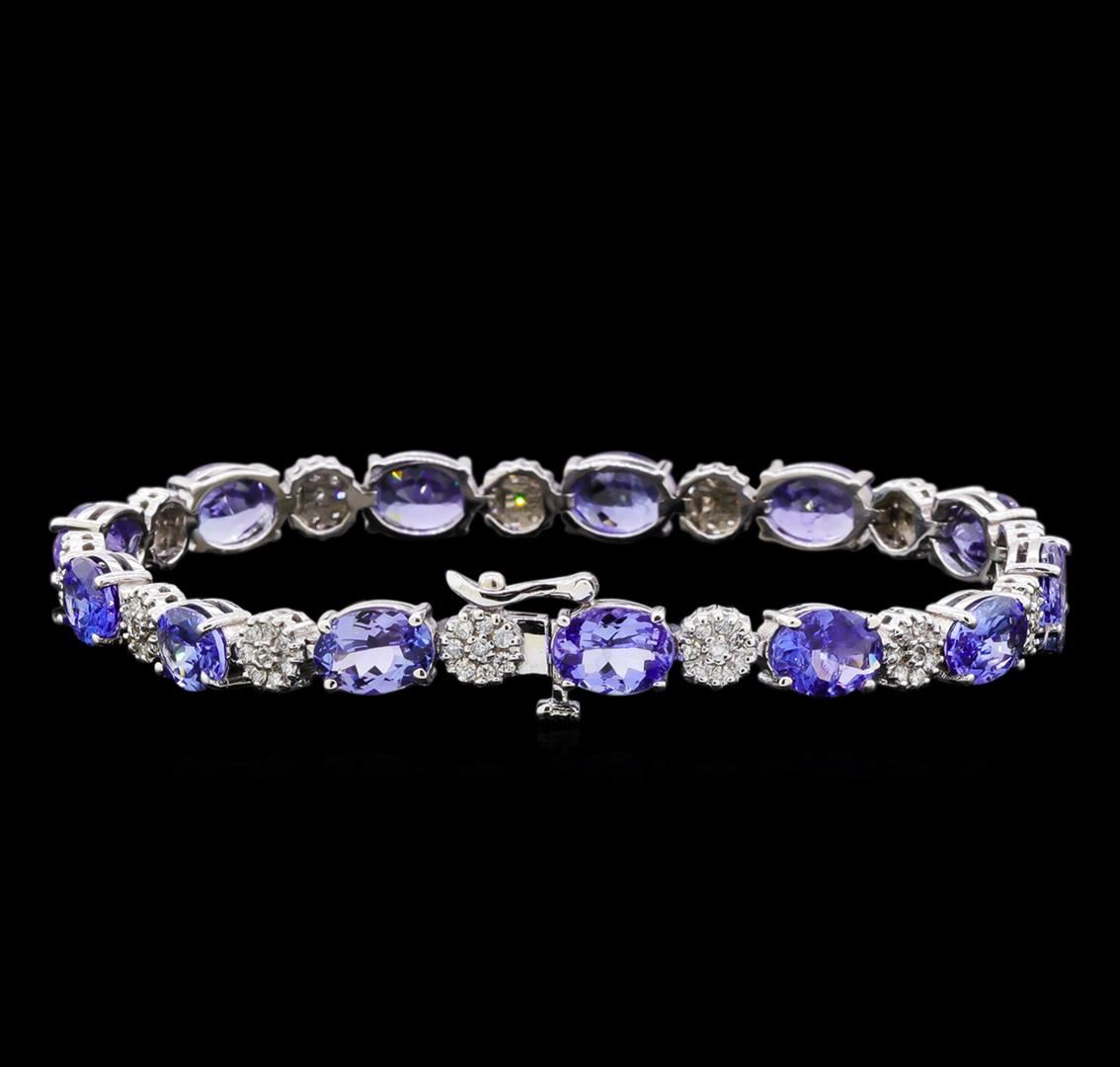 One electronically tested 14KT white gold lady's combination cast & assembled fashion straight line bracelet with a tongue clasp with foldover safety with a bright polish finish. The featured lady's bracelet is 7.25 inches in length. Identified with markings of "14K". Condition is new, good workmanship. Containing: Thirteen prong set oval modified brilliant cut natural tanzanites, measuring 7.90 x 5.90 x 3.72mm, (depth est.) approximate total weight of 16.02ct., clarity is eye clean, medium, moderately strong, violetish blue color, (GIA vB 5/4), cut is good. Transmitting light with no distortion, transparent. Colored gemstones are presumed to have been subjected to commonly used enhancement processes. Graded in the setting. Thirteen prong set round brilliant cut diamonds, measuring 1.60 - 1.50 x 0.98mm (depth est.) approximate total weight of 13 Stones = 0.20ct. Graded in the setting. Clarity: VS-2 to SI-1. Color: G - Good Ninety-One prong set round brilliant cut diamonds, measuring 1.40 - 1.35 x 0.83mm (depth est.) approximate total weight of 91 Stones = 0.92ct. Graded in the setting. Clarity: SI-1 to SI-2. Color: G - Good. Total Weight of Colored Stones 16.02ct. Total Weight of Diamonds 1.12ct. Total Weight of Straight Line Bracelet 14.70gm. GAS Appraised at $21,800.00.