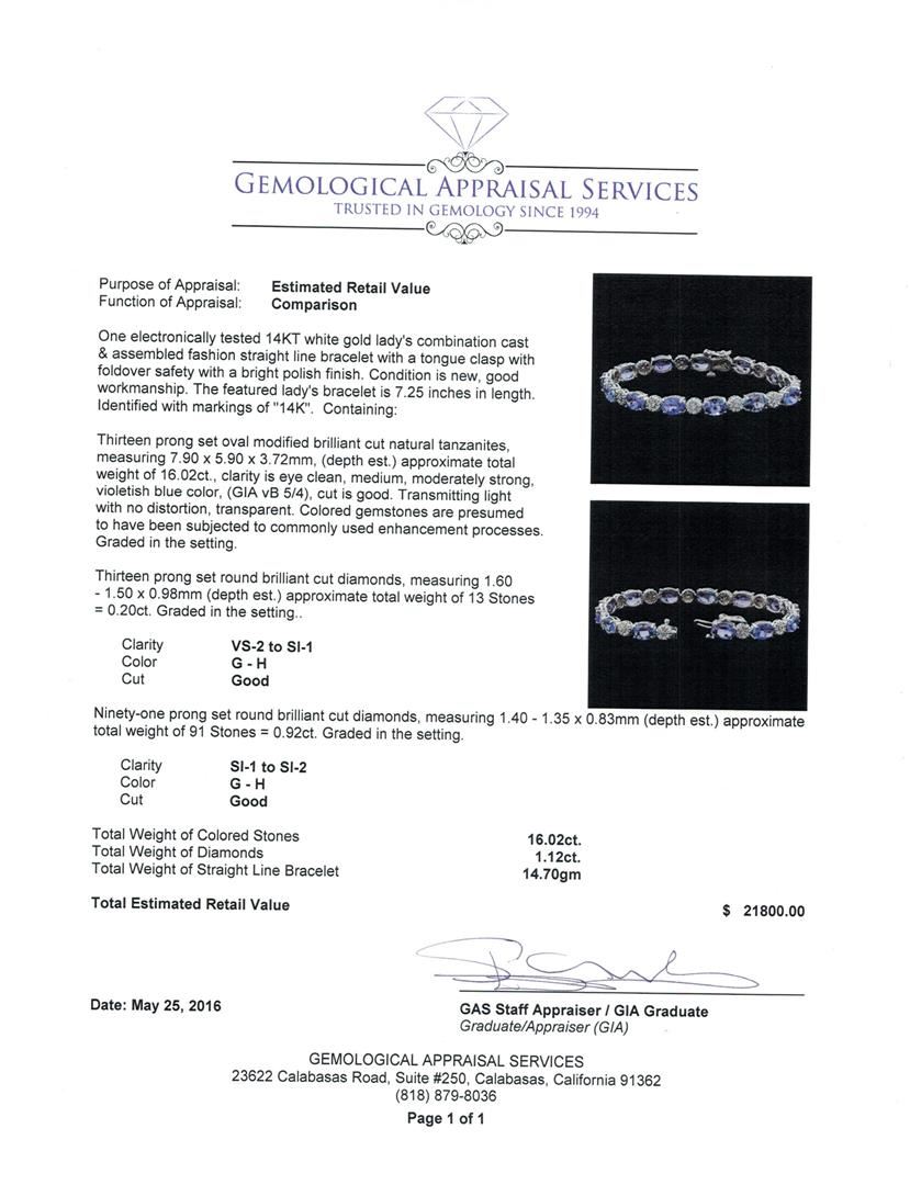 One electronically tested 14KT white gold lady's combination cast & assembled fashion straight line bracelet with a tongue clasp with foldover safety with a bright polish finish. The featured lady's bracelet is 7.25 inches in length. Identified with markings of "14K". Condition is new, good workmanship. Containing: Thirteen prong set oval modified brilliant cut natural tanzanites, measuring 7.90 x 5.90 x 3.72mm, (depth est.) approximate total weight of 16.02ct., clarity is eye clean, medium, moderately strong, violetish blue color, (GIA vB 5/4), cut is good. Transmitting light with no distortion, transparent. Colored gemstones are presumed to have been subjected to commonly used enhancement processes. Graded in the setting. Thirteen prong set round brilliant cut diamonds, measuring 1.60 - 1.50 x 0.98mm (depth est.) approximate total weight of 13 Stones = 0.20ct. Graded in the setting. Clarity: VS-2 to SI-1. Color: G - Good Ninety-One prong set round brilliant cut diamonds, measuring 1.40 - 1.35 x 0.83mm (depth est.) approximate total weight of 91 Stones = 0.92ct. Graded in the setting. Clarity: SI-1 to SI-2. Color: G - Good. Total Weight of Colored Stones 16.02ct. Total Weight of Diamonds 1.12ct. Total Weight of Straight Line Bracelet 14.70gm. GAS Appraised at $21,800.00.