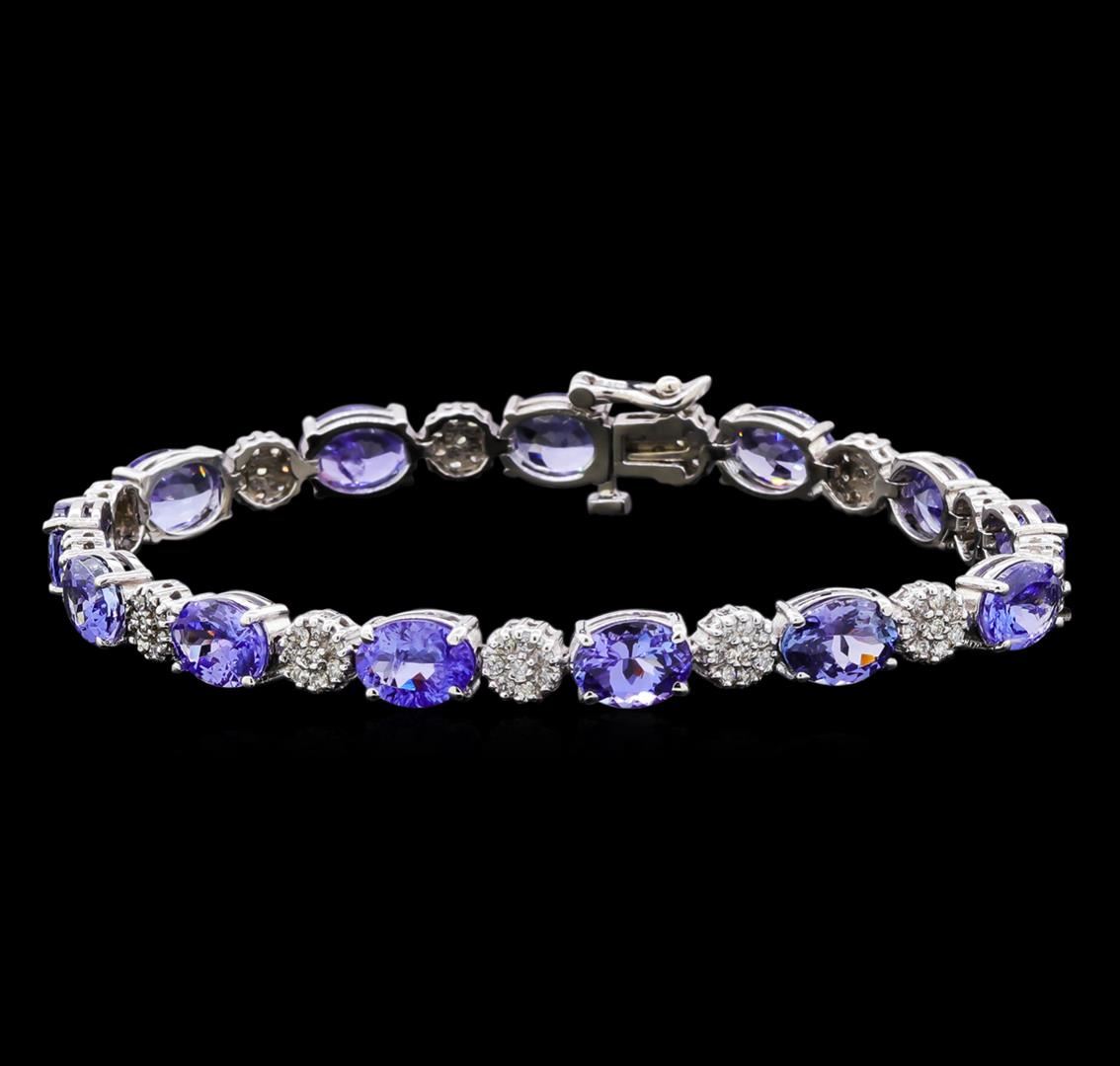 One electronically tested 14KT white gold lady's combination cast & assembled fashion straight line bracelet with a tongue clasp with foldover safety with a bright polish finish. The featured lady's bracelet is 7.25 inches in length. Identified with markings of "14K". Condition is new, good workmanship. Containing: Thirteen prong set oval modified brilliant cut natural tanzanites, measuring 7.90 x 5.90 x 3.72mm, (depth est.) approximate total weight of 16.02ct., clarity is eye clean, medium, moderately strong, violetish blue color, (GIA vB 5/4), cut is good. Transmitting light with no distortion, transparent. Colored gemstones are presumed to have been subjected to commonly used enhancement processes. Graded in the setting. Thirteen prong set round brilliant cut diamonds, measuring 1.60 - 1.50 x 0.98mm (depth est.) approximate total weight of 13 Stones = 0.20ct. Graded in the setting. Clarity: VS-2 to SI-1. Color: G - Good Ninety-One prong set round brilliant cut diamonds, measuring 1.40 - 1.35 x 0.83mm (depth est.) approximate total weight of 91 Stones = 0.92ct. Graded in the setting. Clarity: SI-1 to SI-2. Color: G - Good. Total Weight of Colored Stones 16.02ct. Total Weight of Diamonds 1.12ct. Total Weight of Straight Line Bracelet 14.70gm. GAS Appraised.