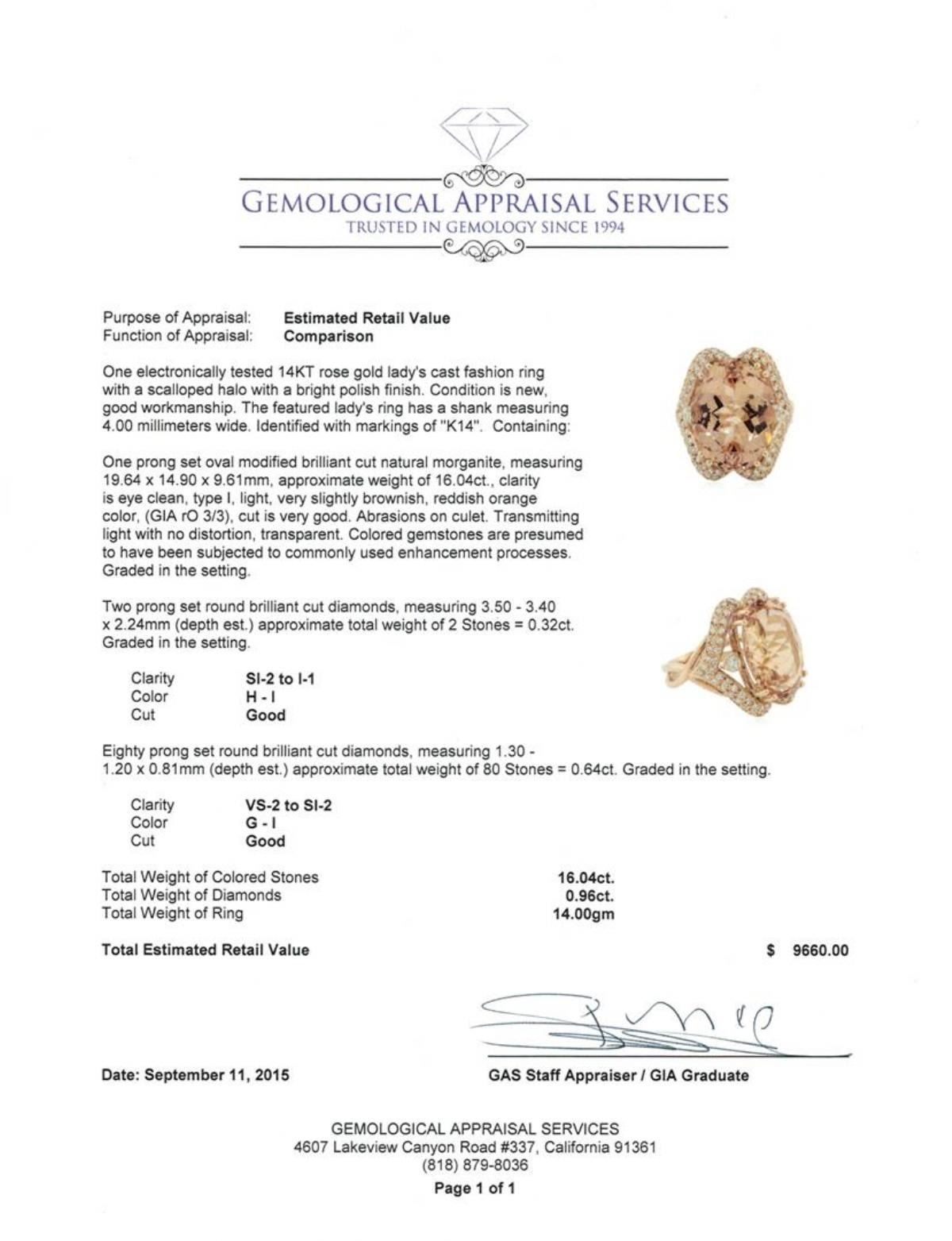 One electronically tested 14KT rose gold lady's cast fashion ring with a scalloped halo with a bright polish finish. The featured lady's ring has a shank measuring 4.00 millimeters wide. Identified with markings of "K14". Condition is new, good workmanship. Containing: One prong set oval modified brilliant cut natural morganite, measuring 19.64 x 14.90 x 9.61mm, approximate weight of 16.04ct., clarity is eye clean, type I, light, very slightly brownish, reddish orange color, (GIA rO 3/3), cut is very good. Abrasions on culet. Transmitting light with no distortion, transparent. Colored gemstones are presumed to have been subjected to commonly used enhancement processes. Graded in the setting. Two prong set round brilliant cut diamonds, measuring 3.50 - 3.40 x 2.24mm (depth est.) approximate total weight of 2 Stones = 0.32ct. Graded in the setting. Clarity: SI-2 to I-1. Color: H - I. Cut Good Eighty prong set round brilliant cut diamonds, measuring 1.30 - 1.20 x 0.81mm (depth est.) approximate total weight of 80 Stones = 0.64ct. Graded in the setting. Clarity: VS-2 to SI-2. Color: G - I. Cut Good. Total Weight of Colored Stones 16.04ct. Total Weight of Diamonds 0.96ct. Total Weight of Ring 14.00gm. GAS Appraised.