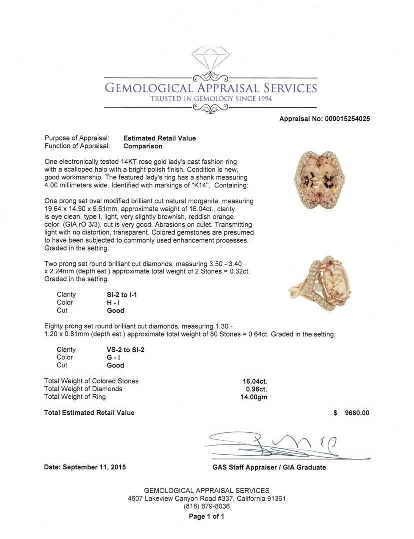 One electronically tested 14KT rose gold lady's cast fashion ring with a scalloped halo with a bright polish finish. The featured lady's ring has a shank measuring 4.00 millimeters wide. Identified with markings of "K14". Condition is new, good workmanship. Containing: One prong set oval modified brilliant cut natural morganite, measuring 19.64 x 14.90 x 9.61mm, approximate weight of 16.04ct., clarity is eye clean, type I, light, very slightly brownish, reddish orange color, (GIA rO 3/3), cut is very good. Abrasions on culet. Transmitting light with no distortion, transparent. Colored gemstones are presumed to have been subjected to commonly used enhancement processes. Graded in the setting. Two prong set round brilliant cut diamonds, measuring 3.50 - 3.40 x 2.24mm (depth est.) approximate total weight of 2 Stones = 0.32ct. Graded in the setting. Clarity: SI-2 to I-1. Color: H - I. Cut Good Eighty prong set round brilliant cut diamonds, measuring 1.30 - 1.20 x 0.81mm (depth est.) approximate total weight of 80 Stones = 0.64ct. Graded in the setting. Clarity: VS-2 to SI-2. Color: G - I. Cut Good. Total Weight of Colored Stones 16.04ct. Total Weight of Diamonds 0.96ct. Total Weight of Ring 14.00gm. GAS Appraised at $9,660.00.