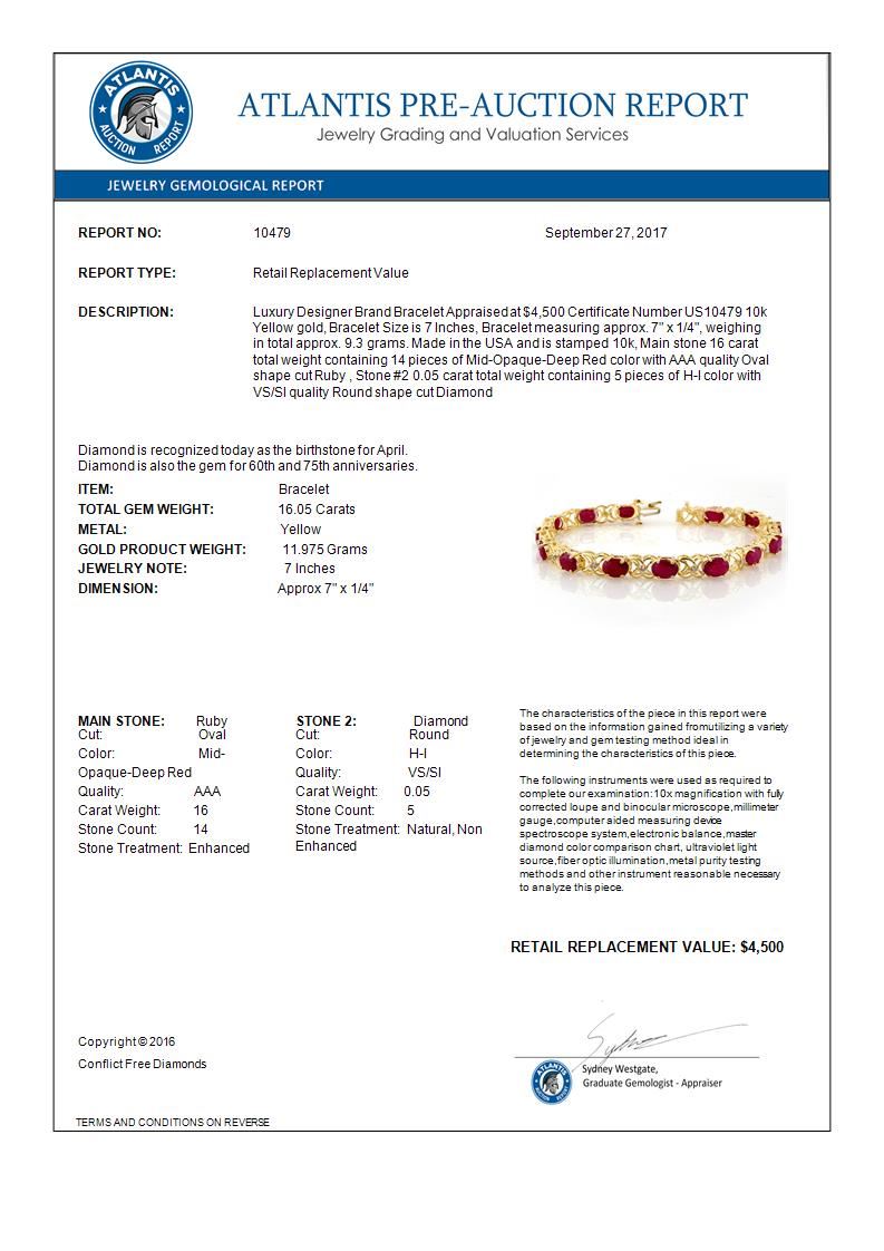 10479 - REF-63X3R ---- 16.05 CTW Ruby & Diamond Bracelet 10K Yellow Gold ---- Luxury Designer Brand Bracelet Appraised at $4,500 Certificate Number US10479 10k Yellow gold, Bracelet Size is 7 Inches, Bracelet measuring approx. 7" x 1/4", weighing in total approx. 9.3 grams. Made in the USA and is stamped 10k, Main stone 16 carat total weight containing 14 pieces of Mid-Opaque-Deep Red color with AAA quality Oval shape cut Ruby , Stone #2 0.05 carat total weight containing 5 pieces of H-I color with VS/SI quality Round shape cut Diamond
