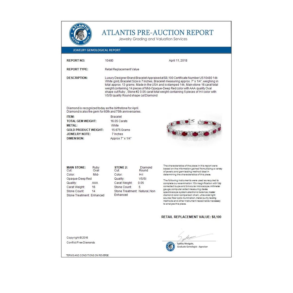 REF-105K5W -10480 ---- 16.05 CTW Ruby & Diamond Bracelet 14K White Gold ---- Luxury Designer Brand Bracelet Appraised at $8,100 Certificate Number US10480 14k White gold, Bracelet Size is 7 Inches, Bracelet measuring approx. 7" x 1/4", weighing in total approx. 13 grams. Made in the USA and is stamped 14k, Main stone 16 carat total weight containing 14 pieces of Mid-Opaque-Deep Red color with AAA quality Oval shape cut Ruby , Stone #2 0.05 carat total weight containing 5 pieces of H-I color with VS/SI quality Round shape cut Diamond