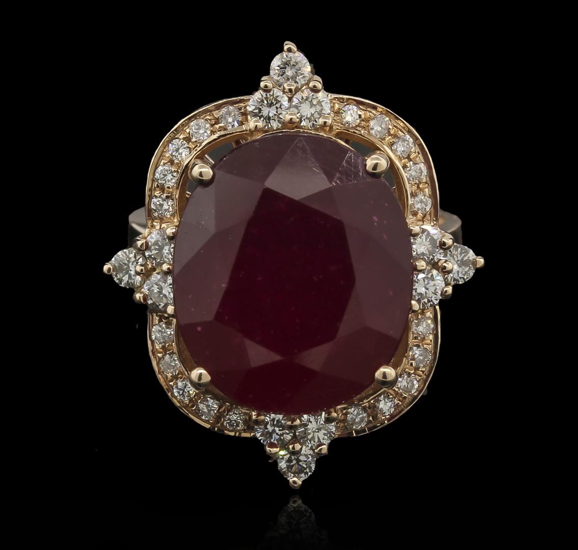 One electronically tested 14KT rose gold lady's cast fashion ring with a basket setting with a bright polish finish. The featured lady's ring has a scalloped halo motif with a 3.10 millimeter wide shank. Identified with markings of "K14". Condition is new, good workmanship. Containing: One prong set oval mixed cut natural ruby, measuring 15.95 x 13.65 x 8.00mm, 10% bulge factor, approximate weight of 16.06ct., clarity is severely included, type II, very dark, very slightly brownish, red color, (GIA R 8/3), cut is good. Transmitting light somewhat diffusely, semi-transparent to translucent. Naturally occurring internal & external characteristics are present. Indications of laboratory high temperature heat treatment, with glass & flux additives. Graded in the setting. Twelve prong set round brilliant cut diamonds, measuring 2.40 - 2.35 x 1.43mm (depth est.) approximate total weight of 12 Stones = 0.58ct. Graded in the setting. Clarity: SI-1 to SI-2. Color: H - I. Cut Good Twenty bead set round brilliant cut diamonds, measuring 1.40 - 1.30 x 0.88mm (depth est.) approximate total weight of 20 Stones = 0.20ct. Graded in the setting. Clarity: SI-1 to I-1. Color: H - J. Cut Good. Total Weight of Colored Stones 16.06ct. Total Weight of Diamonds 0.78ct. Total Weight of Ring 11.50gm. GAS Appraised at $7,695.00.